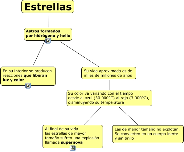 Este Cmap, tiene información relacionada con: Estrellas, Su vida aproximada es de miles de millones de años Su color va variando con el tiempo desde el azul (30.000ºC) al rojo (3.000ºC), disminuyendo su temperatura Al final de su vida las estrellas de mayor tamaño sufren una explosión llamada supernova, Su vida aproximada es de miles de millones de años Su color va variando con el tiempo desde el azul (30.000ºC) al rojo (3.000ºC), disminuyendo su temperatura Las de menor tamaño no explotan. Se convierten en un cuerpo inerte y sin brillo, Estrellas Astros formados por hidrógeno y helio Su vida aproximada es de miles de millones de años, Estrellas Astros formados por hidrógeno y helio En su interior se producen reacciones que liberan luz y calor