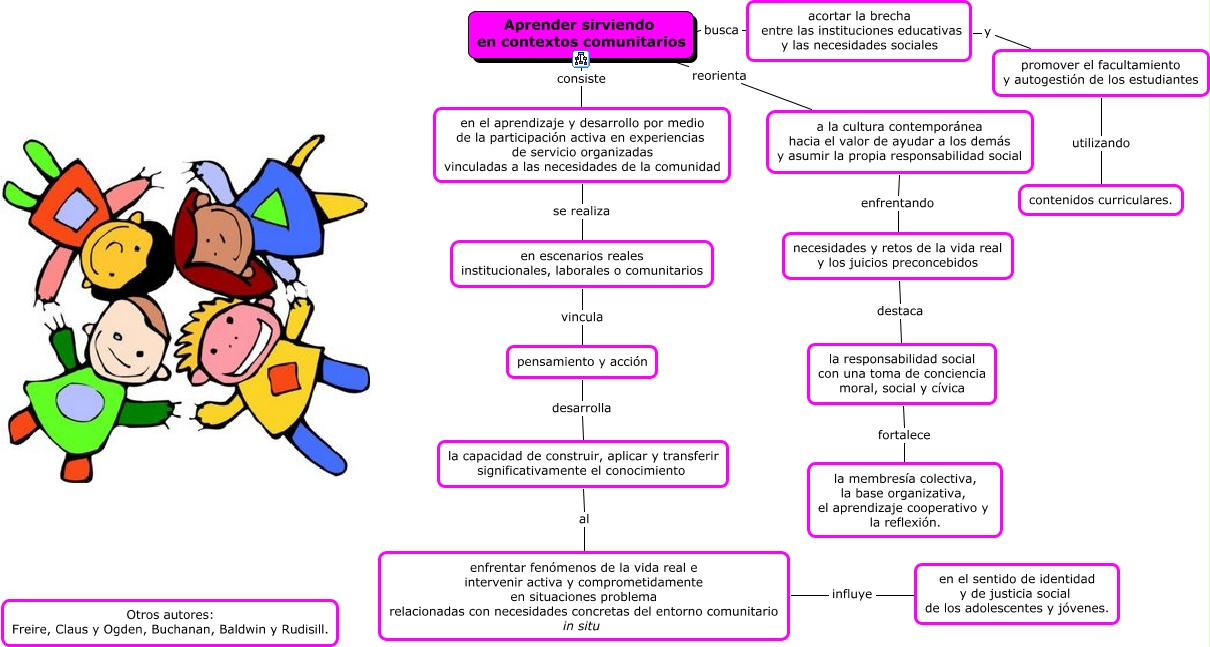 Este Cmap, tiene información relacionada con: Aprender sirviendo, a la cultura contemporánea hacia el valor de ayudar a los demás y asumir la propia responsabilidad social enfrentando necesidades y retos de la vida real y los juicios preconcebidos, acortar la brecha entre las instituciones educativas y las necesidades sociales y promover el facultamiento y autogestión de los estudiantes, pensamiento y acción desarrolla la capacidad de construir, aplicar y transferir significativamente el conocimiento, enfrentar fenómenos de la vida real e intervenir activa y comprometidamente en situaciones problema relacionadas con necesidades concretas del entorno comunitario in situ influye en el sentido de identidad y de justicia social de los adolescentes y jóvenes., Aprender sirviendo en contextos comunitarios busca acortar la brecha entre las instituciones educativas y las necesidades sociales, Aprender sirviendo en contextos comunitarios reorienta a la cultura contemporánea hacia el valor de ayudar a los demás y asumir la propia responsabilidad social, Aprender sirviendo en contextos comunitarios consiste en el aprendizaje y desarrollo por medio de la participación activa en experiencias de servicio organizadas vinculadas a las necesidades de la comunidad, promover el facultamiento y autogestión de los estudiantes utilizando contenidos curriculares., la responsabilidad social con una toma de conciencia moral, social y cívica fortalece la membresía colectiva, la base organizativa, el aprendizaje cooperativo y la reflexión., la capacidad de construir, aplicar y transferir significativamente el conocimiento al enfrentar fenómenos de la vida real e intervenir activa y comprometidamente en situaciones problema relacionadas con necesidades concretas del entorno comunitario in situ, en el aprendizaje y desarrollo por medio de la participación activa en experiencias de servicio organizadas vinculadas a las necesidades de la comunidad se realiza en escenarios reales institucionales, laborales o comunitarios, en escenarios reales institucionales, laborales o comunitarios vincula pensamiento y acción, necesidades y retos de la vida real y los juicios preconcebidos destaca la responsabilidad social con una toma de conciencia moral, social y cívica
