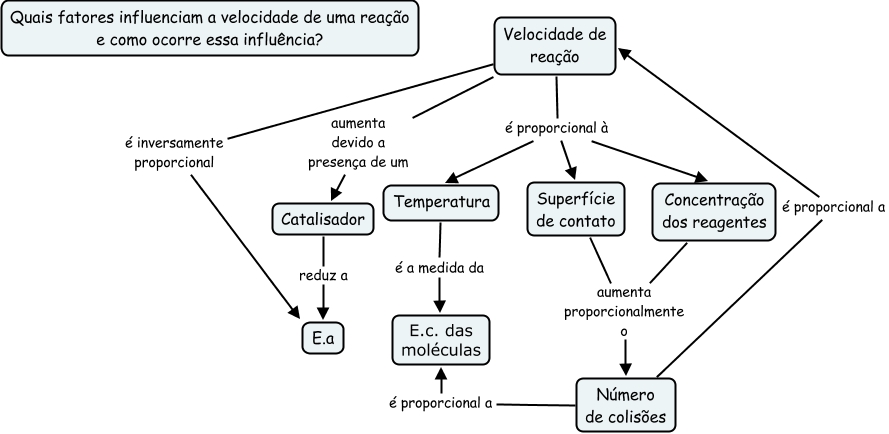 This Concept Map, created with IHMC CmapTools, has information related to: Velocidade I 2A, Número de colisões é proporcional a E.c. das moléculas, Número de colisões é proporcional a Velocidade de reação, Velocidade de reação é inversamente proporcional E.a, Catalisador reduz a E.a, Temperatura é a medida da E.c. das moléculas, Concentração dos reagentes aumenta proporcionalmente o Número de colisões, Velocidade de reação aumenta devido a presença de um Catalisador, Velocidade de reação é proporcional à Concentração dos reagentes, Velocidade de reação é proporcional à Superfície de contato, Velocidade de reação é proporcional à Temperatura, Superfície de contato aumenta proporcionalmente o Número de colisões