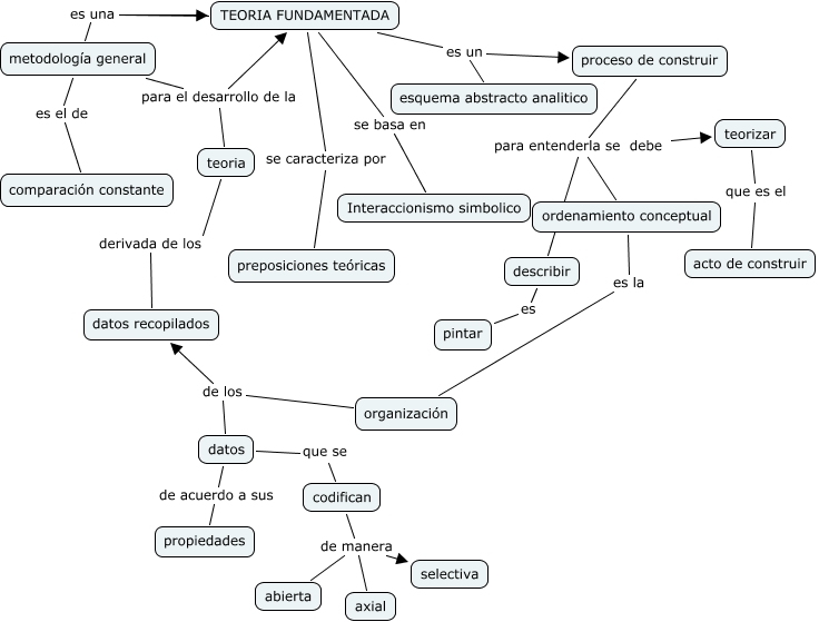 Este Cmap, tiene información relacionada con: teoría fundamentada, TEORIA FUNDAMENTADA es un proceso de construir, metodología general para el desarrollo de la teoria, organización de los datos recopilados, datos de acuerdo a sus propiedades, teoria derivada de los datos recopilados, TEORIA FUNDAMENTADA se caracteriza por preposiciones teóricas, TEORIA FUNDAMENTADA se basa en Interaccionismo simbolico, proceso de construir para entenderla se debe teorizar, proceso de construir para entenderla se debe ordenamiento conceptual, datos que se codifican, ordenamiento conceptual es la organización, proceso de construir para entenderla se debe describir, TEORIA FUNDAMENTADA es una metodología general, codifican de manera selectiva, organización de los datos, codifican de manera abierta, teorizar que es el acto de construir, codifican de manera axial, TEORIA FUNDAMENTADA es un esquema abstracto analitico, describir es pintar