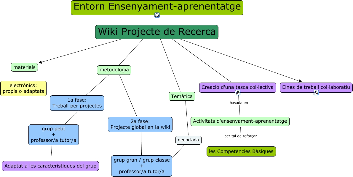 Este Cmap, tiene información relacionada con: entorn, Activitats d'ensenyament-aprenentatge per tal de reforçar les Competències Bàsiques, Wiki Projecte de Recerca ???? Creació d'una tasca col·lectiva, metodologia ???? 2a fase: Projecte global en la wiki, Wiki Projecte de Recerca ???? metodologia, grup petit + professor/a tutor/a ???? Adaptat a les característiques del grup, materials ???? electrònics: propis o adaptats, Wiki Projecte de Recerca ???? Temàtica, Creació d'una tasca col·lectiva basada en Activitats d'ensenyament-aprenentatge, Wiki Projecte de Recerca ???? materials, metodologia ???? 1a fase: Treball per projectes, Wiki Projecte de Recerca ???? Eines de treball col·laboratiu, Entorn Ensenyament-aprenentatge ???? Wiki Projecte de Recerca, 1a fase: Treball per projectes ???? grup petit + professor/a tutor/a, negociada ???? grup gran / grup classe + professor/a tutor/a, Temàtica ???? negociada, 2a fase: Projecte global en la wiki ???? grup gran / grup classe + professor/a tutor/a