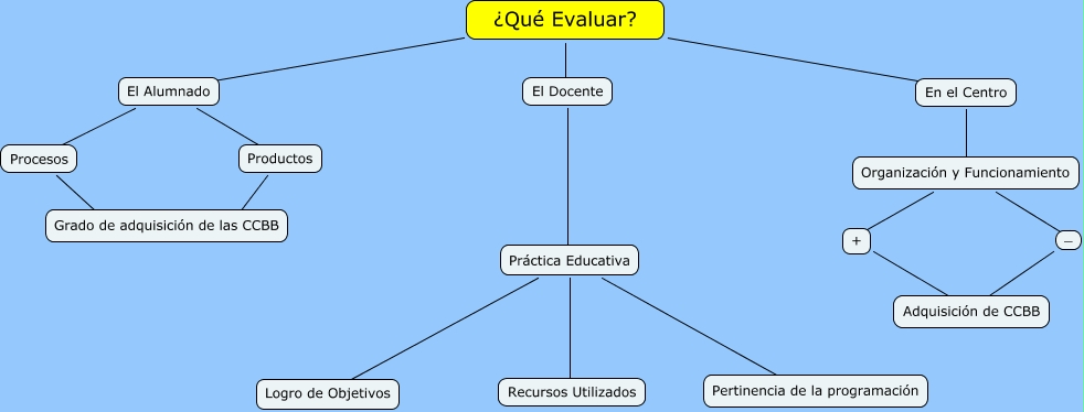 Este Cmap, tiene información relacionada con: qué evaluar, El Docente ???? Práctica Educativa, Práctica Educativa ???? Recursos Utilizados, Organización y Funcionamiento +, Práctica Educativa ???? Pertinencia de la programación, + ???? Adquisición de CCBB, En el Centro ???? Organización y Funcionamiento, ¿Qué Evaluar? ???? En el Centro, Productos ???? Grado de adquisición de las CCBB, ¿Qué Evaluar? ???? El Alumnado, Procesos ???? Grado de adquisición de las CCBB, _ ???? Adquisición de CCBB, Organización y Funcionamiento _, El Alumnado ???? Productos, El Alumnado ???? Procesos, Práctica Educativa ???? Logro de Objetivos, ¿Qué Evaluar? ???? El Docente