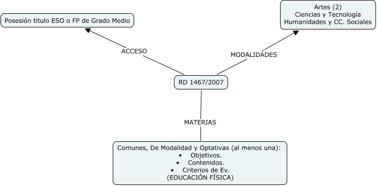 Este Cmap, tiene información relacionada con: RD1467 ENSEÑANZA, RD 1467/2007 ACCESO Posesión titulo ESO o FP de Grado Medio, RD 1467/2007 MATERIAS Comunes, De Modalidad y Optativas (al menos una): • Objetivos. • Contenidos. • Criterios de Ev. (EDUCACIÓN FÍSICA), RD 1467/2007 MODALIDADES Artes (2) Ciencias y Tecnología Humanidades y CC. Sociales
