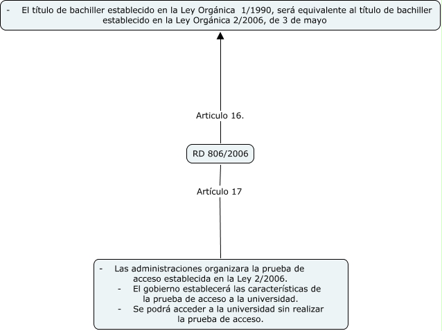 Este Cmap, tiene información relacionada con: rd 806 preámbulo, RD 806/2006 Artículo 17 - Las administraciones organizara la prueba de acceso establecida en la Ley 2/2006. - El gobierno establecerá las características de la prueba de acceso a la universidad. - Se podrá acceder a la universidad sin realizar la prueba de acceso., RD 806/2006 Articulo 16. - El título de bachiller establecido en la Ley Orgánica 1/1990, será equivalente al título de bachiller establecido en la Ley Orgánica 2/2006, de 3 de mayo