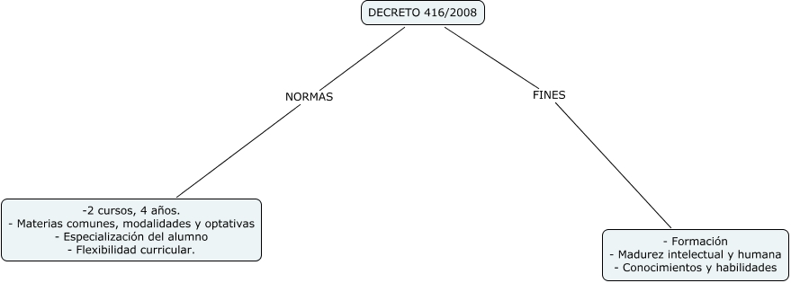 Este Cmap, tiene información relacionada con: decreto 416 preámbulo, DECRETO 416/2008 FINES - Formación - Madurez intelectual y humana - Conocimientos y habilidades, DECRETO 416/2008 NORMAS -2 cursos, 4 años. - Materias comunes, modalidades y optativas - Especialización del alumno - Flexibilidad curricular.