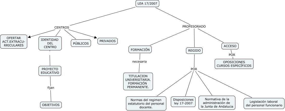 Este Cmap, tiene información relacionada con: LEA 17 2007 CENTROS Y PROF, ACCESO POR OPOSICIONES CURSOS ESPECÍFICOS, PROYECTO EDUCATIVO fijan OBJETIVOS, FORMACIÓN necesaria TITULACION UNIVERSITARIA. FORMACIÓN PERMANENTE., REGIDO POR Disposiciones ley 17-2007, IDENTIDAD DEL CENTRO PROYECTO EDUCATIVO, LEA 17/2007 CENTROS PRIVADOS, LEA 17/2007 PROFESORADO ACCESO, LEA 17/2007 CENTROS OFERTAR ACT.EXTRACU- RRICULARES, LEA 17/2007 CENTROS IDENTIDAD DEL CENTRO, LEA 17/2007 PROFESORADO FORMACIÓN, LEA 17/2007 PROFESORADO REGIDO, LEA 17/2007 CENTROS PÚBLICOS, REGIDO POR Normas del regimen estatutorio del personal docente., REGIDO POR Normativa de la administración de la Junta de Andalucia, REGIDO POR Legislación laboral del personal funcionario