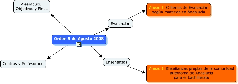 Este Cmap, tiene información relacionada con: Orden 5 Agosto 2008, Evaluación ???? Anexo I: Criterios de Evaluación según materias en Andalucía, Orden 5 de Agosto 2008 ???? Centros y Profesorado, Orden 5 de Agosto 2008 ???? Evaluación, Orden 5 de Agosto 2008 ???? Preambulo, Objetivos y Fines, Enseñanzas ???? Anexo I: Enseñanzas propias de la comunidad autonoma de Andalucía para el bachillerato, Orden 5 de Agosto 2008 ???? Enseñanzas