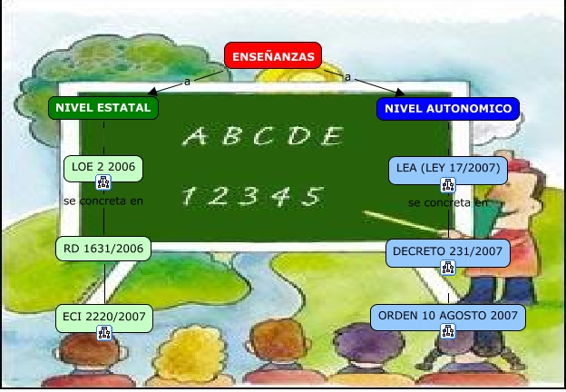 Este Cmap, tiene información relacionada con: Enseñanzas, LOE 2 2006 se concreta en RD 1631/2006, ENSEÑANZAS a NIVEL AUTONOMICO, NIVEL ESTATAL LOE 2 2006, NIVEL AUTONOMICO LEA (LEY 17/2007), RD 1631/2006 ???? ECI 2220/2007, LEA (LEY 17/2007) se concreta en DECRETO 231/2007, ENSEÑANZAS a NIVEL ESTATAL, DECRETO 231/2007 ORDEN 10 AGOSTO 2007