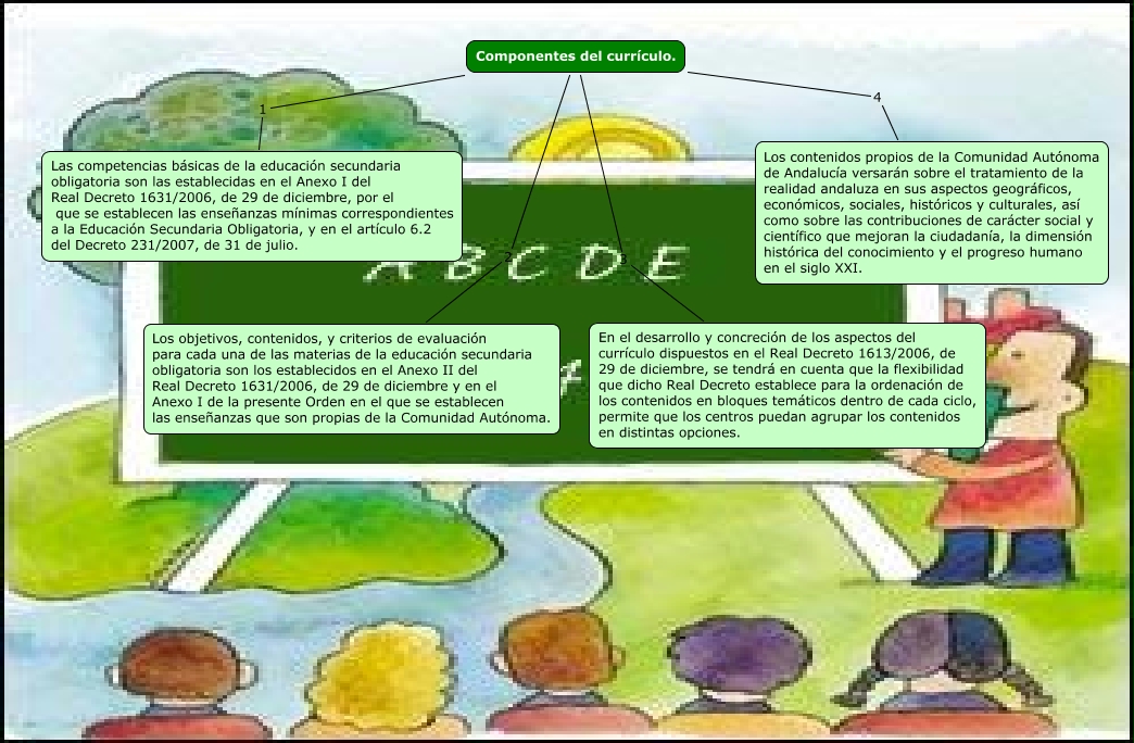 Este Cmap, tiene información relacionada con: Componentes del curriculo (autonomas), Componentes del currículo. 3 En el desarrollo y concreción de los aspectos del currículo dispuestos en el Real Decreto 1613/2006, de 29 de diciembre, se tendrá en cuenta que la flexibilidad que dicho Real Decreto establece para la ordenación de los contenidos en bloques temáticos dentro de cada ciclo, permite que los centros puedan agrupar los contenidos en distintas opciones., Componentes del currículo. 1 Las competencias básicas de la educación secundaria obligatoria son las establecidas en el Anexo I del Real Decreto 1631/2006, de 29 de diciembre, por el que se establecen las enseñanzas mínimas correspondientes a la Educación Secundaria Obligatoria, y en el artículo 6.2 del Decreto 231/2007, de 31 de julio., Componentes del currículo. 2 Los objetivos, contenidos, y criterios de evaluación para cada una de las materias de la educación secundaria obligatoria son los establecidos en el Anexo II del Real Decreto 1631/2006, de 29 de diciembre y en el Anexo I de la presente Orden en el que se establecen las enseñanzas que son propias de la Comunidad Autónoma., Componentes del currículo. 4 Los contenidos propios de la Comunidad Autónoma de Andalucía versarán sobre el tratamiento de la realidad andaluza en sus aspectos geográficos, económicos, sociales, históricos y culturales, así como sobre las contribuciones de carácter social y científico que mejoran la ciudadanía, la dimensión histórica del conocimiento y el progreso humano en el siglo XXI.