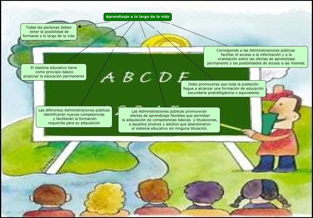 Este Cmap, tiene información relacionada con: Aprendizaje a lo largo de la vida, Aprendizaje a lo largo de la vida Todas las personas deben tener la posibilidad de formarse a lo largo de la vida, Aprendizaje a lo largo de la vida El sistema educativo tiene como principio básico propiciar la educación permanente, Aprendizaje a lo largo de la vida Las diferentes Administraciones públicas identificarán nuevas competencias y facilitarán la formación requerida para su adquisición, Aprendizaje a lo largo de la vida Corresponde a las Administraciones públicas facilitar el acceso a la información y a la orientación sobre las ofertas de aprendizaje permanente y las posibilidades de acceso a las mismas., Aprendizaje a lo largo de la vida Debe promoverse que toda la población llegue a alcanzar una formación de educación secundaria postobligatoria o equivalente., Aprendizaje a lo largo de la vida Las Administraciones públicas promoveran ofertas de aprendizaje flexibles que permitan la adquisición de competencias básicas y titulaciones, a aquellos jóvenes y adultos que abandonaron el sistema educativo sin ninguna titulación.