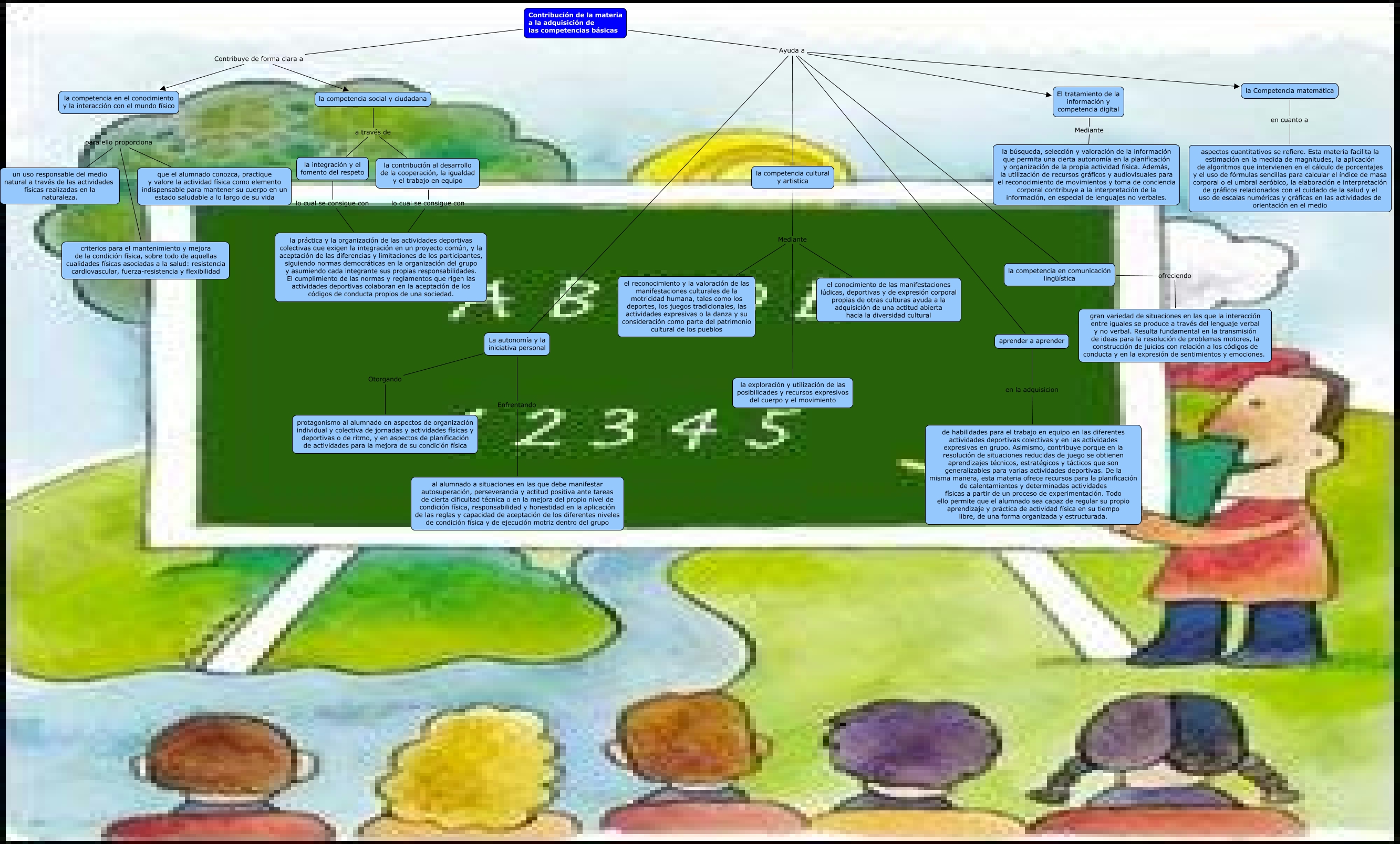 Este Cmap, tiene información relacionada con: Contribucion de EF a las CB, la competencia cultural y artistica Mediante el conocimiento de las manifestaciones lúdicas, deportivas y de expresión corporal propias de otras culturas ayuda a la adquisición de una actitud abierta hacia la diversidad cultural, aprender a aprender en la adquisicion de habilidades para el trabajo en equipo en las diferentes actividades deportivas colectivas y en las actividades expresivas en grupo. Asimismo, contribuye porque en la resolución de situaciones reducidas de juego se obtienen aprendizajes técnicos, estratégicos y tácticos que son generalizables para varias actividades deportivas. De la misma manera, esta materia ofrece recursos para la planificación de calentamientos y determinadas actividades físicas a partir de un proceso de experimentación. Todo ello permite que el alumnado sea capaz de regular su propio aprendizaje y práctica de actividad física en su tiempo libre, de una forma organizada y estructurada., la Competencia matemática en cuanto a aspectos cuantitativos se refiere. Esta materia facilita la estimación en la medida de magnitudes, la aplicación de algoritmos que intervienen en el cálculo de porcentajes y el uso de fórmulas sencillas para calcular el índice de masa corporal o el umbral aeróbico, la elaboración e interpretación de gráficos relacionados con el cuidado de la salud y el uso de escalas numéricas y gráficas en las actividades de orientación en el medio, Contribución de la materia a la adquisición de las competencias básicas Ayuda a La autonomía y la iniciativa personal, la competencia social y ciudadana a través de la integración y el fomento del respeto, Contribución de la materia a la adquisición de las competencias básicas Ayuda a la competencia en comunicación lingüística, la competencia en el conocimiento y la interacción con el mundo físico para ello proporciona que el alumnado conozca, practique y valore la actividad física como elemento indispensable para mantener su cuerpo en un estado saludable a lo largo de su vida, la competencia en el conocimiento y la interacción con el mundo físico para ello proporciona un uso responsable del medio natural a través de las actividades físicas realizadas en la naturaleza., la competencia cultural y artistica Mediante la exploración y utilización de las posibilidades y recursos expresivos del cuerpo y el movimiento, La autonomía y la iniciativa personal Enfrentando al alumnado a situaciones en las que debe manifestar autosuperación, perseverancia y actitud positiva ante tareas de cierta dificultad técnica o en la mejora del propio nivel de condición física, responsabilidad y honestidad en la aplicación de las reglas y capacidad de aceptación de los diferentes niveles de condición física y de ejecución motriz dentro del grupo, la competencia en comunicación lingüística ofreciendo gran variedad de situaciones en las que la interacción entre iguales se produce a través del lenguaje verbal y no verbal. Resulta fundamental en la transmisión de ideas para la resolución de problemas motores, la construcción de juicios con relación a los códigos de conducta y en la expresión de sentimientos y emociones., Contribución de la materia a la adquisición de las competencias básicas Ayuda a aprender a aprender, la competencia cultural y artistica Mediante el reconocimiento y la valoración de las manifestaciones culturales de la motricidad humana, tales como los deportes, los juegos tradicionales, las actividades expresivas o la danza y su consideración como parte del patrimonio cultural de los pueblos, Contribución de la materia a la adquisición de las competencias básicas Ayuda a la Competencia matemática, Contribución de la materia a la adquisición de las competencias básicas Ayuda a El tratamiento de la información y competencia digital, la contribución al desarrollo de la cooperación, la igualdad y el trabajo en equipo lo cual se consigue con la práctica y la organización de las actividades deportivas colectivas que exigen la integración en un proyecto común, y la aceptación de las diferencias y limitaciones de los participantes, siguiendo normas democráticas en la organización del grupo y asumiendo cada integrante sus propias responsabilidades. El cumplimiento de las normas y reglamentos que rigen las actividades deportivas colaboran en la aceptación de los códigos de conducta propios de una sociedad., Contribución de la materia a la adquisición de las competencias básicas Contribuye de forma clara a la competencia social y ciudadana, Contribución de la materia a la adquisición de las competencias básicas Contribuye de forma clara a la competencia en el conocimiento y la interacción con el mundo físico, la integración y el fomento del respeto lo cual se consigue con la práctica y la organización de las actividades deportivas colectivas que exigen la integración en un proyecto común, y la aceptación de las diferencias y limitaciones de los participantes, siguiendo normas democráticas en la organización del grupo y asumiendo cada integrante sus propias responsabilidades. El cumplimiento de las normas y reglamentos que rigen las actividades deportivas colaboran en la aceptación de los códigos de conducta propios de una sociedad., la competencia social y ciudadana a través de la contribución al desarrollo de la cooperación, la igualdad y el trabajo en equipo