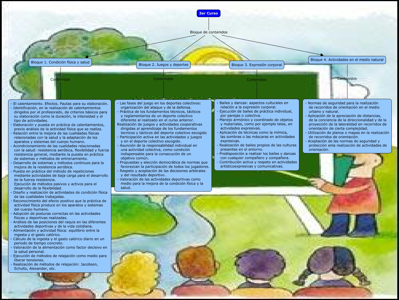 Este Cmap, tiene información relacionada con: 3er curso, 3er Curso Bloque de contenidos Bloque 3. Expresión corporal, Bloque 2. Juegos y deportes Contenidos - Las fases del juego en los deportes colectivos: organización del ataque y de la defensa. - Práctica de los fundamentos técnicos, tácticos y reglamentarios de un deporte colectivo diferente al realizado en el curso anterior. Realización de juegos y actividades cooperativas dirigidas al aprendizaje de los fundamentos tecnicos y tácticos del deporte colectivo escogido - Participación activa en las actividades y juegos y en el deporte colectivo escogido. - Asunción de la responsabilidad individual en una actividad colectiva, como condición indispensable para la consecución de un objetivo común. - Propuestas y elección democrática de normas que favorezcan la participación de todos los jugadores. - Respeto y aceptación de las decisiones arbitrales y del resultado deportivo. - Valoración de las actividades deportivas como medio para la mejora de la condición física y la salud., 3er Curso Bloque de contenidos Bloque 4. Actividades en el medio natural, 3er Curso Bloque de contenidos Bloque 1. Condición física y salud, 3er Curso Bloque de contenidos Bloque 2. Juegos y deportes, Bloque 1. Condición física y salud Contenidos - El calentamiento. Efectos. Pautas para su elaboración. - Identificación, en la realización de calentamientos dirigidos por el profesorado, de criterios básicos para su elaboración como la duración, la intensidad y el tipo de actividades. - Elaboración y puesta en práctica de calentamientos, previo análisis de la actividad física que se realiza. - Relación entre la mejora de las cualidades físicas relacionadas con la salud y la adaptación de los aparatos y sistemas del cuerpo humano. - Acondicionamiento de las cualidades relacionadas con la salud: resistencia aeróbica, flexibilidad y fuerza resistencia general, mediante la puesta en práctica de sistemas y métodos de entrenamiento. - Desarrollo de sistemas y métodos continuos para la mejora de la resistencia aeróbica. - Puesta en práctica del método de repeticiones mediante actividades de baja carga para el desarrollo de la fuerza resistencia. Ejecución de métodos pasivos y activos para el desarrollo de la flexibilidad. - Diseño y realización de actividades de condición física de las cualidades trabajadas. - Reconocimiento del efecto positivo que la práctica de actividad física produce en los aparatos y sistemas del cuerpo humano. - Adopción de posturas correctas en las actividades físicas y deportivas realizadas. - Análisis de las posiciones del raquis en las diferentes actividades deportivas y de la vida cotidiana. - Alimentación y actividad física: equilibrio entre la ingesta y el gasto calórico. - Cálculo de la ingesta y el gasto calórico diario en un periodo de tiempo concreto. - Valoración de la alimentación como factor decisivo en la salud personal. - Ejecución de métodos de relajación como medio para liberar tensiones. - Realización de métodos de relajación: Jacobson, Schultz, Alexander, etc., Bloque 4. Actividades en el medio natural Contenidos - Normas de seguridad para la realización de recorridos de orientación en el medio urbano y natural. - Aplicación de la apreciación de distancias, de la conciencia de la direccionalidad y de la proyección de la lateralidad en recorridos de orientación de cierta complejidad. - Utilización de planos o mapas en la realización de recorridos de orientación. - Aceptación de las normas de seguridad y protección enla realización de actividades de orientación., Bloque 3. Expresión corporal Contenidos - Bailes y danzas: aspectos culturales en relación a la expresión corporal. - Ejecución de bailes de práctica individual, por parejas o colectiva. - Manejo armónico y coordinado de objetos y materiales, como por ejemplo telas, en actividades expresivas. - Aplicación de técnicas como la mímica, las sombras o las máscaras en actividades expresivas. - Realización de bailes propios de las culturas presentes en el entorno. - Predisposición a realizar los bailes y danzas con cualquier compañero y compañera. - Contribución activa y respeto en actividades artísticoexpresivas y comunicativas.