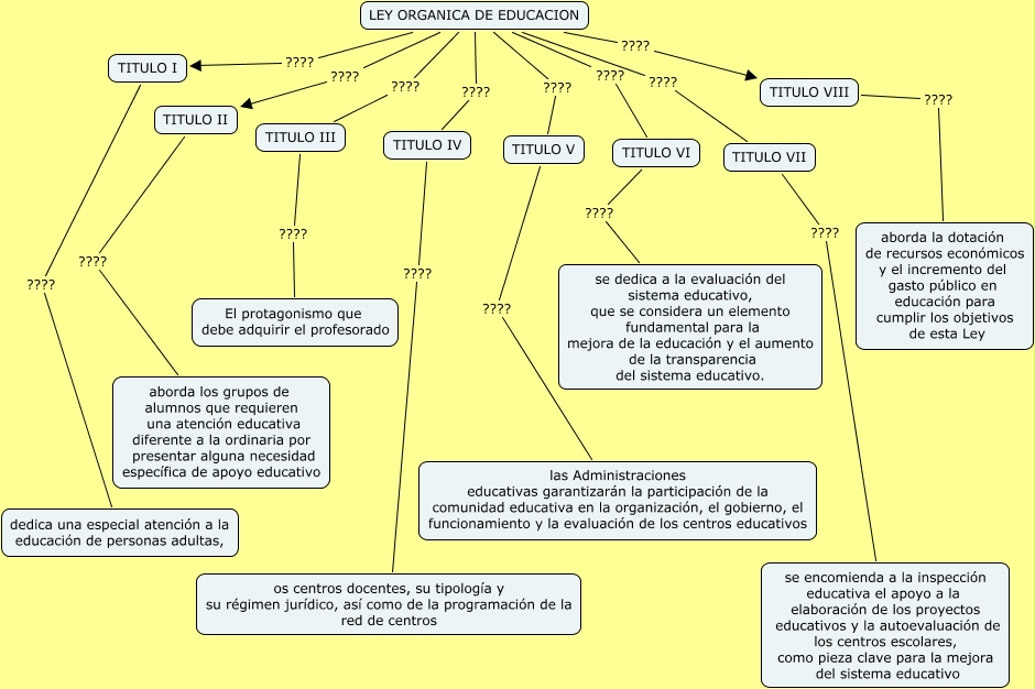 Este Cmap, tiene información relacionada con: MAPA PREAMBULO LOE, TITULO VII ???? se encomienda a la inspección educativa el apoyo a la elaboración de los proyectos educativos y la autoevaluación de los centros escolares, como pieza clave para la mejora del sistema educativo, LEY ORGANICA DE EDUCACION ???? TITULO VII, TITULO IV ???? os centros docentes, su tipología y su régimen jurídico, así como de la programación de la red de centros, TITULO III ???? El protagonismo que debe adquirir el profesorado, LEY ORGANICA DE EDUCACION ???? TITULO II, LEY ORGANICA DE EDUCACION ???? TITULO I, LEY ORGANICA DE EDUCACION ???? TITULO V, LEY ORGANICA DE EDUCACION ???? TITULO VIII, LEY ORGANICA DE EDUCACION ???? TITULO VI, TITULO II ???? aborda los grupos de alumnos que requieren una atención educativa diferente a la ordinaria por presentar alguna necesidad específica de apoyo educativo, LEY ORGANICA DE EDUCACION ???? TITULO III, TITULO V ???? las Administraciones educativas garantizarán la participación de la comunidad educativa en la organización, el gobierno, el funcionamiento y la evaluación de los centros educativos, LEY ORGANICA DE EDUCACION ???? TITULO IV, TITULO VI ???? se dedica a la evaluación del sistema educativo, que se considera un elemento fundamental para la mejora de la educación y el aumento de la transparencia del sistema educativo., TITULO VIII ???? aborda la dotación de recursos económicos y el incremento del gasto público en educación para cumplir los objetivos de esta Ley, TITULO I ???? dedica una especial atención a la educación de personas adultas,