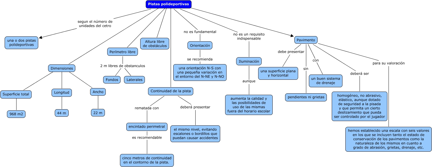 Este Cmap, tiene información relacionada con: Pistas polideportivas, Orientación se recomienda una orientación N-S con una pequeña variación en el entorno del N-NE y N-NO, Iluminación aunque aumenta la calidad y las posibilidades de uso de las mismas fuera del horario escolar, Pistas polideportivas ???? Continuidad de la pista, Dimensiones ???? Ancho, Pistas polideportivas no es un requisito indispensable Iluminación, Pavimento para su valoración hemos establecido una escala con seis valores en los que se incluyen tanto el estado de conservación de los pavimentos como la naturaleza de los mismos en cuanto a grado de abrasión, grietas, drenaje, etc., Continuidad de la pista rematada con encintado perimetral, Superficie total ???? 968 m2, Longitud ???? 44 m, Pavimento deberá ser homogéneo, no abrasivo, elástico, aunque dotado de seguridad a la pisada y que permita un cierto deslizamiento que pueda ser controlado por el jugador, Pistas polideportivas ???? Altura libre de obstáculos, Dimensiones ???? Superficie total, Pistas polideportivas ???? Dimensiones, Perímetro libre 2 m libres de obstanculos Laterales, Pavimento debe presentar una superficie plana y horizontal, Pistas polideportivas ???? Perímetro libre, Perímetro libre 2 m libres de obstanculos Fondos, Continuidad de la pista deberá presentar el mismo nivel, evitando escalones o bordillos que puedan causar accidentes, encintado perimetral es recomendable cinco metros de continuidad en el contorno de la pista., Pavimento sin pendientes ni grietas