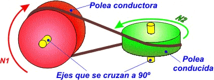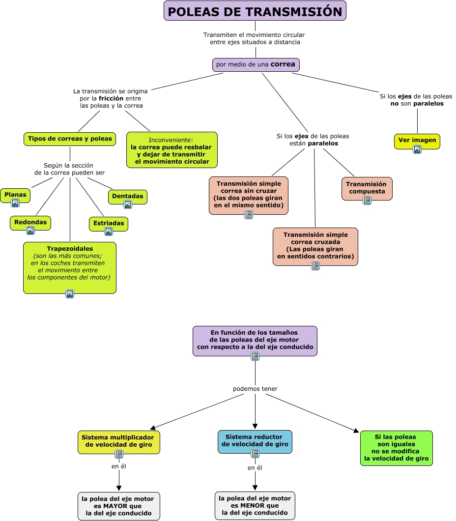 Este Cmap, tiene información relacionada con: Poleas de transmision, por medio de una correa Si los ejes de las poleas están paralelos Transmisión compuesta, Sistema reductor de velocidad de giro en él la polea del eje motor es MENOR que la del eje conducido, por medio de una correa La transmisión se origina por la fricción entre las poleas y la correa Tipos de correas y poleas, En función de los tamaños de las poleas del eje motor con respecto a la del eje conducido podemos tener Si las poleas son iguales no se modifica la velocidad de giro, Tipos de correas y poleas Según la sección de la correa pueden ser Estriadas, por medio de una correa Si los ejes de las poleas están paralelos Transmisión simple correa cruzada (Las poleas giran en sentidos contrarios), por medio de una correa La transmisión se origina por la fricción entre las poleas y la correa Inconveniente: la correa puede resbalar y dejar de transmitir el movimiento circular, Tipos de correas y poleas Según la sección de la correa pueden ser Trapezoidales (son las más comunes; en los coches transmiten el movimiento entre los componentes del motor), por medio de una correa Si los ejes de las poleas están paralelos Transmisión simple correa sin cruzar (las dos poleas giran en el mismo sentido), Sistema multiplicador de velocidad de giro en él la polea del eje motor es MAYOR que la del eje conducido, Tipos de correas y poleas Según la sección de la correa pueden ser Dentadas, En función de los tamaños de las poleas del eje motor con respecto a la del eje conducido podemos tener Sistema reductor de velocidad de giro, por medio de una correa Si los ejes de las poleas no son paralelos Ver imagen, Tipos de correas y poleas Según la sección de la correa pueden ser Planas, En función de los tamaños de las poleas del eje motor con respecto a la del eje conducido podemos tener Sistema multiplicador de velocidad de giro, Tipos de correas y poleas Según la sección de la correa pueden ser Redondas