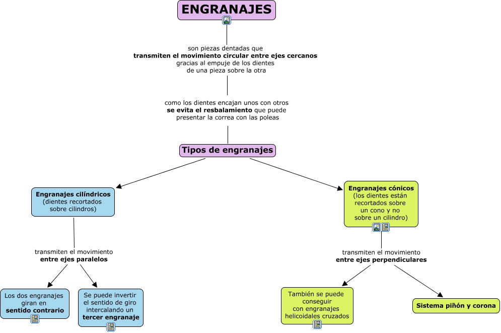 Este Cmap, tiene información relacionada con: Engranajes, Engranajes cónicos (los dientes están recortados sobre un cono y no sobre un cilindro) transmiten el movimiento entre ejes perpendiculares También se puede conseguir con engranajes helicoidales cruzados, Engranajes cilíndricos (dientes recortados sobre cilindros) transmiten el movimiento entre ejes paralelos Se puede invertir el sentido de giro intercalando un tercer engranaje, como los dientes encajan unos con otros se evita el resbalamiento que puede presentar la correa con las poleas Tipos de engranajes Engranajes cilíndricos (dientes recortados sobre cilindros), Engranajes cilíndricos (dientes recortados sobre cilindros) transmiten el movimiento entre ejes paralelos Los dos engranajes giran en sentido contrario, Engranajes cónicos (los dientes están recortados sobre un cono y no sobre un cilindro) transmiten el movimiento entre ejes perpendiculares Sistema piñón y corona, ENGRANAJES son piezas dentadas que transmiten el movimiento circular entre ejes cercanos gracias al empuje de los dientes de una pieza sobre la otra como los dientes encajan unos con otros se evita el resbalamiento que puede presentar la correa con las poleas, como los dientes encajan unos con otros se evita el resbalamiento que puede presentar la correa con las poleas Tipos de engranajes Engranajes cónicos (los dientes están recortados sobre un cono y no sobre un cilindro)