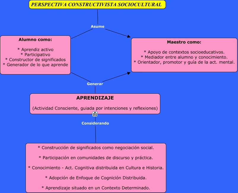 Este Cmap, tiene información relacionada con: CAPITULO 1.2, Alumno como: * Aprendiz activo * Participativo * Constructor de significados * Generador de lo que aprende Generar Maestro como: * Apoyo de contextos socioeducativos. * Mediador entre alumno y conocimiento. * Orientador, promotor y guía de la act. mental., PERSPECTIVA CONSTRUCTIVISTA SOCIOCULTURAL Asume Maestro como: * Apoyo de contextos socioeducativos. * Mediador entre alumno y conocimiento. * Orientador, promotor y guía de la act. mental., PERSPECTIVA CONSTRUCTIVISTA SOCIOCULTURAL Asume Alumno como: * Aprendiz activo * Participativo * Constructor de significados * Generador de lo que aprende, APRENDIZAJE (Actividad Consciente, guiada por intenciones y reflexiones) Considerando * Construcción de significados como negociación social. * Participación en comunidades de discurso y práctica. * Conocimiento - Act. Cognitiva distribuida en Cultura e Historia. * Adopción de Enfoque de Cognición Distribuida. * Aprendizaje situado en un Contexto Determinado., Alumno como: * Aprendiz activo * Participativo * Constructor de significados * Generador de lo que aprende Generar APRENDIZAJE (Actividad Consciente, guiada por intenciones y reflexiones)