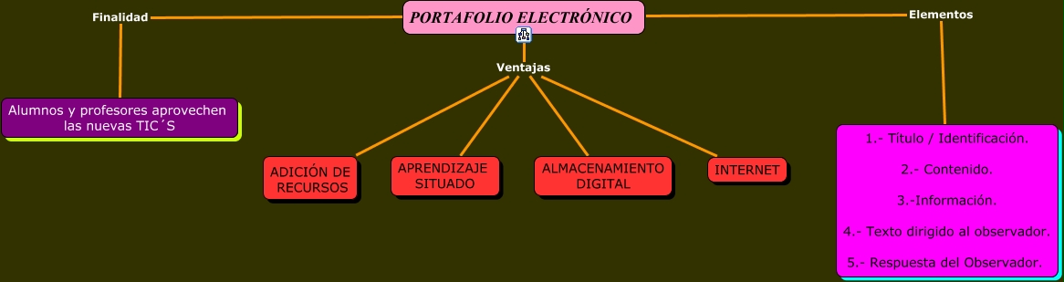 Este Cmap, tiene información relacionada con: CAPITULO 5.4, PORTAFOLIO ELECTRÓNICO Ventajas APRENDIZAJE SITUADO, PORTAFOLIO ELECTRÓNICO Ventajas ALMACENAMIENTO DIGITAL, PORTAFOLIO ELECTRÓNICO Ventajas INTERNET, PORTAFOLIO ELECTRÓNICO Elementos 1.- Título / Identificación. 2.- Contenido. 3.-Información. 4.- Texto dirigido al observador. 5.- Respuesta del Observador., PORTAFOLIO ELECTRÓNICO Finalidad Alumnos y profesores aprovechen las nuevas TIC´S, PORTAFOLIO ELECTRÓNICO Ventajas ADICIÓN DE RECURSOS