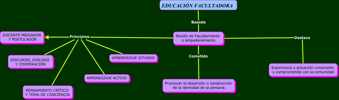 Este Cmap, tiene información relacionada con: CAPITULO 4.2, Noción de Facultamiento o empoderamiento Principios APRENDIZAJE SITUADO, Noción de Facultamiento o empoderamiento Cometido Promover el desarrollo o construcción de la identidad de la persona., Noción de Facultamiento o empoderamiento Destaca Experiencia y actuación consciente y comprometida con la comunidad, Noción de Facultamiento o empoderamiento Principios APRENDIZAJE ACTIVO, EDUCACIÓN FACULTADORA Basada Noción de Facultamiento o empoderamiento, Noción de Facultamiento o empoderamiento Principios DOCENTE MEDIADOR Y POSTULADOR, Noción de Facultamiento o empoderamiento Principios DISCURSO, DIÁLOGO Y COOPERACIÓN, Noción de Facultamiento o empoderamiento Principios PENSAMIENTO CRÍTICO Y TOMA DE CONCIENCIA