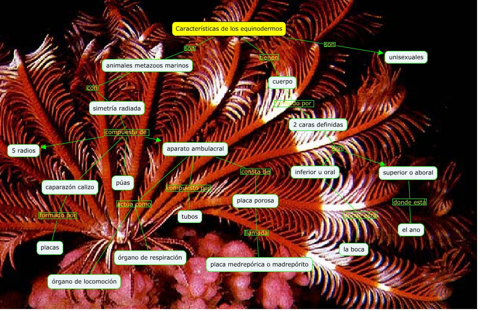 Este Cmap, tiene información relacionada con: equinodermos, 2 caras definidas son inferior u oral, Características de los equinodermos tienen cuerpo, simetría radiada compuesta de caparazón calizo, aparato ambulacral compuesto por tubos, simetría radiada compuesta de 5 radios, aparato ambulacral actúa como órgano de respiración, cuerpo formado por 2 caras definidas, aparato ambulacral consta de placa porosa, Características de los equinodermos son animales metazoos marinos, placa porosa llamada placa medrepórica o madrepórito, superior o aboral donde está el ano, caparazón calizo formado por placas, Características de los equinodermos son unisexuales, animales metazoos marinos con simetría radiada, 2 caras definidas son superior o aboral, aparato ambulacral actúa como órgano de locomoción, simetría radiada compuesta de aparato ambulacral, simetría radiada compuesta de púas, inferior u oral donde está la boca