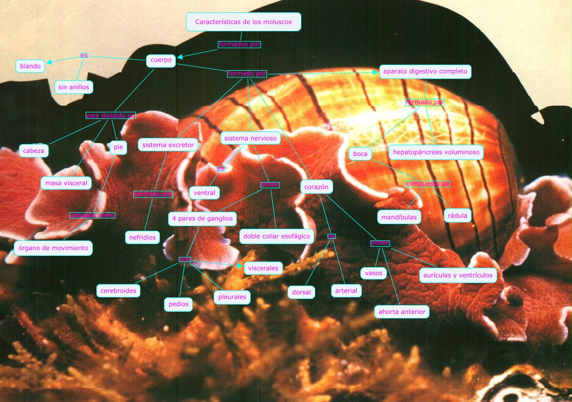 Este Cmap, tiene información relacionada con: moluscos, sistema nervioso posee doble collar esofágico, 4 pares de ganglios son cerebroides, sistema nervioso es ventral, corazón es dorsal, cuerpo formado por aparato digestivo completo, corazón posee vasos, corazón es arterial, aparato digestivo completo formado por boca, cuerpo es sin anillos, cuerpo formado por sistema nervioso, boca compuesta de rádula, aparato digestivo completo formado por hepatopáncreas voluminoso, corazón posee ahorta anterior, cuerpo está dividido en cabeza, 4 pares de ganglios son viscerales, boca compuesta de mandíbulas, corazón posee aurículas y ventrículos, pie utilizado como órgano de movimiento, cuerpo formado por sistema excretor, cuerpo es blando