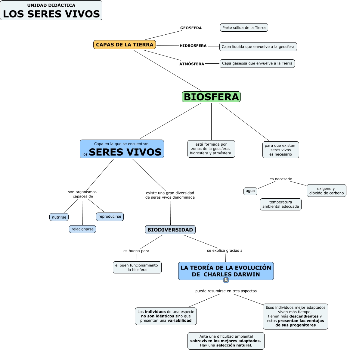 Este Cmap, tiene información relacionada con: Biosfera y Teoria Evolucion, BIODIVERSIDAD es buena para el buen funcionamiento la biosfera, BIODIVERSIDAD se explica gracias a LA TEORÍA DE LA EVOLUCIÓN DE CHARLES DARWIN, LA TEORÍA DE LA EVOLUCIÓN DE CHARLES DARWIN puede resumirse en tres aspectos Esos individuos mejor adaptados viven más tiempo, tienen más descendientes y estos presentan las ventajas de sus progenitores, para que existan seres vivos es necesario es necesario temperatura ambiental adecuada, CAPAS DE LA TIERRA BIOSFERA Capa en la que se encuentran los SERES VIVOS, CAPAS DE LA TIERRA GEOSFERA Parte sólida de la Tierra, Capa en la que se encuentran los SERES VIVOS son organismos capaces de reproducirse, Capa en la que se encuentran los SERES VIVOS existe una gran diversidad de seres vivos denominada BIODIVERSIDAD, Capa en la que se encuentran los SERES VIVOS son organismos capaces de relacionarse, LA TEORÍA DE LA EVOLUCIÓN DE CHARLES DARWIN puede resumirse en tres aspectos Ante una dificultad ambiental sobreviven los mejores adaptados. Hay una selección natural., CAPAS DE LA TIERRA BIOSFERA está formada por zonas de la geosfera, hidrosfera y atmósfera, Capa en la que se encuentran los SERES VIVOS son organismos capaces de nutrirse, CAPAS DE LA TIERRA HIDROSFERA Capa líquida que envuelve a la geosfera, LA TEORÍA DE LA EVOLUCIÓN DE CHARLES DARWIN puede resumirse en tres aspectos Los individuos de una especie no son idénticos sino que presentan una variabilidad, para que existan seres vivos es necesario es necesario oxígeno y dióxido de carbono, para que existan seres vivos es necesario es necesario agua, CAPAS DE LA TIERRA BIOSFERA para que existan seres vivos es necesario, CAPAS DE LA TIERRA ATMÓSFERA Capa gaseosa que envuelve a la Tierra