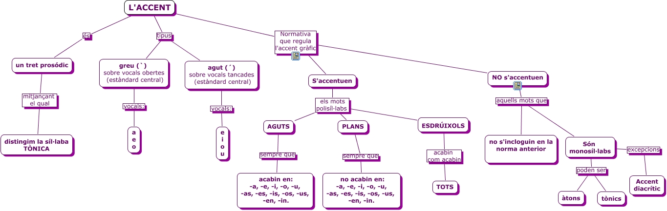 Este Cmap, tiene información relacionada con: l'accent, NO s'accentuen aquells mots que no s'incloguin en la norma anterior, S'accentuen els mots polisíl·labs ESDRÚIXOLS, S'accentuen els mots polisíl·labs PLANS, ESDRÚIXOLS acabin com acabin TOTS, L'ACCENT tipus greu (`) sobre vocals obertes (estàndard central), Són monosíl·labs excepcions Accent diacrític, AGUTS sempre que acabin en: -a, -e, -i, -o, -u, -as, -es, -is, -os, -us, -en, -in., un tret prosódic mitjançant el qual distingim la síl·laba TÒNICA, Són monosíl·labs poden ser àtons, PLANS sempre que no acabin en: -a, -e, -i, -o, -u, -as, -es, -is, -os, -us, -en, -in., S'accentuen els mots polisíl·labs AGUTS, NO s'accentuen aquells mots que Són monosíl·labs, agut (´) sobre vocals tancades (estàndard central) vocals: e i o u, L'ACCENT tipus agut (´) sobre vocals tancades (estàndard central), L'ACCENT Normativa que regula l'accent gràfic S'accentuen, Són monosíl·labs poden ser tònics, L'ACCENT Normativa que regula l'accent gràfic NO s'accentuen, greu (`) sobre vocals obertes (estàndard central) vocals: a e o, L'ACCENT és un tret prosódic