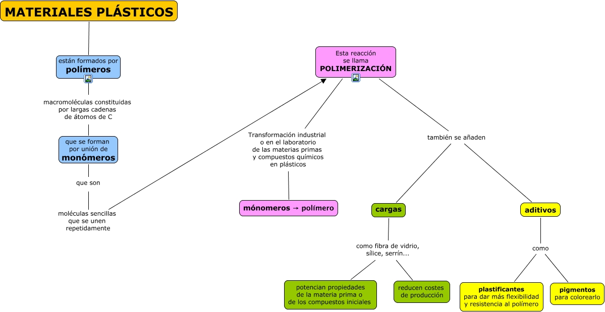Este Cmap, tiene información relacionada con: 2 Materiales plasticos, que son moléculas sencillas que se unen repetidamente Esta reacción se llama POLIMERIZACIÓN, Esta reacción se llama POLIMERIZACIÓN Transformación industrial o en el laboratorio de las materias primas y compuestos químicos en plásticos mónomeros → polímero, MATERIALES PLÁSTICOS están formados por polímeros macromoléculas constituidas por largas cadenas de átomos de C, Esta reacción se llama POLIMERIZACIÓN también se añaden cargas, cargas como fibra de vidrio, sílice, serrín... potencian propiedades de la materia prima o de los compuestos iniciales, Esta reacción se llama POLIMERIZACIÓN también se añaden aditivos, macromoléculas constituidas por largas cadenas de átomos de C que se forman por unión de monómeros que son, aditivos como pigmentos para colorearlo, aditivos como plastificantes para dar más flexibilidad y resistencia al polímero, cargas como fibra de vidrio, sílice, serrín... reducen costes de producción