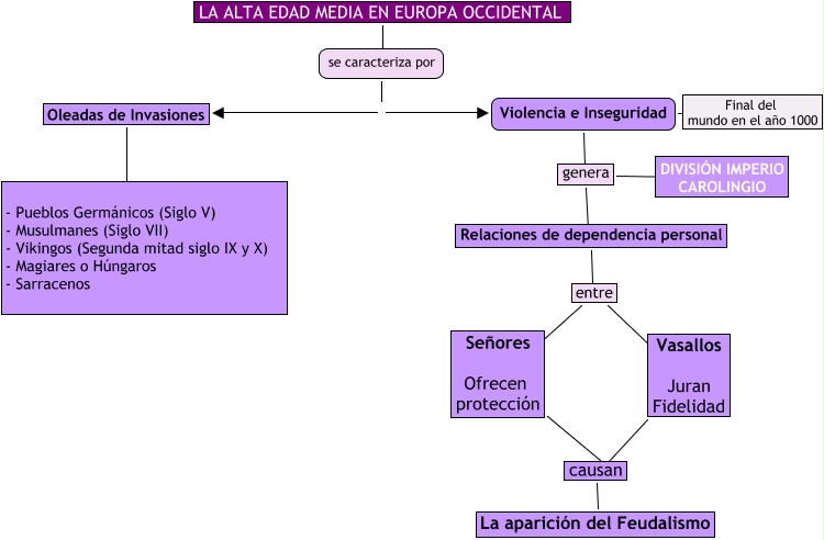 Este Cmap, tiene información relacionada con: Origenes_feudalismo, Señores Ofrecen protección ???? causan, Violencia e Inseguridad ???? Final del mundo en el año 1000, Violencia e Inseguridad ???? genera, Oleadas de Invasiones ???? - Pueblos Germánicos (Siglo V) - Musulmanes (Siglo VII) - Vikingos (Segunda mitad siglo IX y X) - Magiares o Húngaros - Sarracenos, genera ???? Relaciones de dependencia personal, causan ???? La aparición del Feudalismo, - Pueblos Germánicos (Siglo V) - Musulmanes (Siglo VII) - Vikingos (Segunda mitad siglo IX y X) - Magiares o Húngaros - Sarracenos ???? ????, LA ALTA EDAD MEDIA EN EUROPA OCCIDENTAL ???? se caracteriza por, se caracteriza por Violencia e Inseguridad, se caracteriza por Oleadas de Invasiones, entre ???? Señores Ofrecen protección, Vasallos Juran Fidelidad ???? causan, - Pueblos Germánicos (Siglo V) - Musulmanes (Siglo VII) - Vikingos (Segunda mitad siglo IX y X) - Magiares o Húngaros - Sarracenos ???? ????, entre ???? Vasallos Juran Fidelidad, Relaciones de dependencia personal ???? entre, genera ???? DIVISIÓN IMPERIO CAROLINGIO, Oleadas de Invasiones ???? - Pueblos Germánicos (Siglo V) - Musulmanes (Siglo VII) - Vikingos (Segunda mitad siglo IX y X) - Magiares o Húngaros - Sarracenos