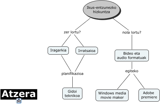 Este Cmap, tiene información relacionada con: ikus-entzun ona, Iragarkia planifikazioa Gidoi teknikoa, Bideo eta audio formatuak egiteko Adobe premiere, Bideo eta audio formatuak egiteko Windows media movie maker, Irratsaioa planifikazioa Gidoi teknikoa, Ikus-entzunezko hizkuntza nola lortu? Bideo eta audio formatuak, Ikus-entzunezko hizkuntza zer lortu? Irratsaioa, Ikus-entzunezko hizkuntza zer lortu? Iragarkia