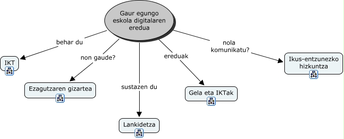 Este Cmap, tiene información relacionada con: orokorra ona, Gaur egungo eskola digitalaren eredua non gaude? Ezagutzaren gizartea, Gaur egungo eskola digitalaren eredua behar du IKT, Gaur egungo eskola digitalaren eredua ereduak Gela eta IKTak, Gaur egungo eskola digitalaren eredua sustazen du Lankidetza, Gaur egungo eskola digitalaren eredua nola komunikatu? Ikus-entzunezko hizkuntza