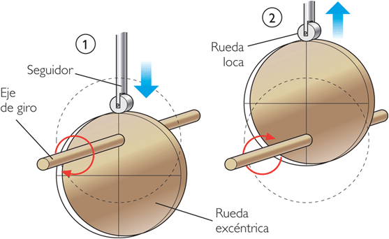 Este Cmap, tiene información relacionada con: Mecanismos movim_circular a rectilineo alternativo, RUEDA EXCÉNTRICA rueda que gira por un eje que no pasa por su centro produce el efecto de una leva, LEVA rueda con resalte al girar la leva el resalte empuja al seguidor movíendose éste arriba y abajo, MECANISMOS QUE TRANSFORMAN UN MOVIMIENTO CIRCULAR EN RECTILÍNEO ALTERNATIVO SON BIELA-MANIVELA (es reversible), MECANISMOS QUE TRANSFORMAN UN MOVIMIENTO CIRCULAR EN RECTILÍNEO ALTERNATIVO SON LEVA, MECANISMOS QUE TRANSFORMAN UN MOVIMIENTO CIRCULAR EN RECTILÍNEO ALTERNATIVO SON CIGÜEÑAL (es reversible), BIELA-MANIVELA (es reversible) transforma el movimiento de giro en otro rectilíneo de vaivén (o en sentido inverso) usado en locomotoras de vapor, CIGÜEÑAL (es reversible) formado por varios sistemas biela-manivela sobre el mismo eje usado en los motores de combustión y en los tiovivos, MECANISMOS QUE TRANSFORMAN UN MOVIMIENTO CIRCULAR EN RECTILÍNEO ALTERNATIVO SON RUEDA EXCÉNTRICA