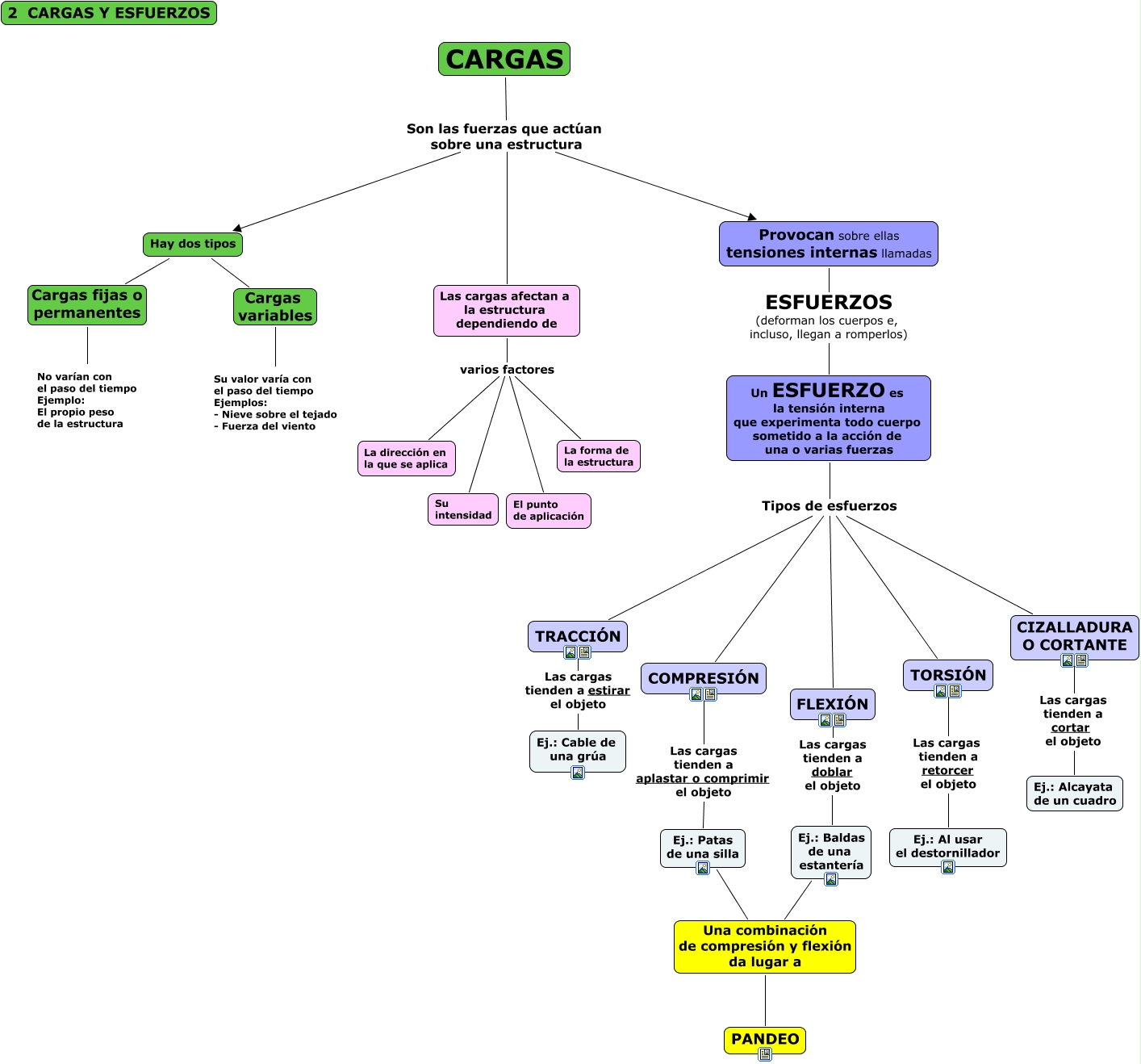 Este Cmap, tiene información relacionada con: 2 Cargas y Esfuerzos, Las cargas afectan a la estructura dependiendo de varios factores La forma de la estructura, Un ESFUERZO es la tensión interna que experimenta todo cuerpo sometido a la acción de una o varias fuerzas Tipos de esfuerzos CIZALLADURA O CORTANTE, CARGAS Son las fuerzas que actúan sobre una estructura Las cargas afectan a la estructura dependiendo de, CARGAS Son las fuerzas que actúan sobre una estructura Hay dos tipos, Las cargas afectan a la estructura dependiendo de varios factores Su intensidad, Las cargas afectan a la estructura dependiendo de varios factores El punto de aplicación, Ej.: Patas de una silla Una combinación de compresión y flexión da lugar a PANDEO, Un ESFUERZO es la tensión interna que experimenta todo cuerpo sometido a la acción de una o varias fuerzas Tipos de esfuerzos TRACCIÓN, Hay dos tipos Cargas fijas o permanentes No varían con el paso del tiempo Ejemplo: El propio peso de la estructura, FLEXIÓN Las cargas tienden a doblar el objeto Ej.: Baldas de una estantería, Las cargas afectan a la estructura dependiendo de varios factores La dirección en la que se aplica, Ej.: Baldas de una estantería Una combinación de compresión y flexión da lugar a PANDEO, CIZALLADURA O CORTANTE Las cargas tienden a cortar el objeto Ej.: Alcayata de un cuadro, Provocan sobre ellas tensiones internas llamadas ESFUERZOS (deforman los cuerpos e, incluso, llegan a romperlos) Un ESFUERZO es la tensión interna que experimenta todo cuerpo sometido a la acción de una o varias fuerzas, COMPRESIÓN Las cargas tienden a aplastar o comprimir el objeto Ej.: Patas de una silla, TRACCIÓN Las cargas tienden a estirar el objeto Ej.: Cable de una grúa, Hay dos tipos Cargas variables Su valor varía con el paso del tiempo Ejemplos: - Nieve sobre el tejado - Fuerza del viento, TORSIÓN Las cargas tienden a retorcer el objeto Ej.: Al usar el destornillador, CARGAS Son las fuerzas que actúan sobre una estructura Provocan sobre ellas tensiones internas llamadas, Un ESFUERZO es la tensión interna que experimenta todo cuerpo sometido a la acción de una o varias fuerzas Tipos de esfuerzos TORSIÓN
