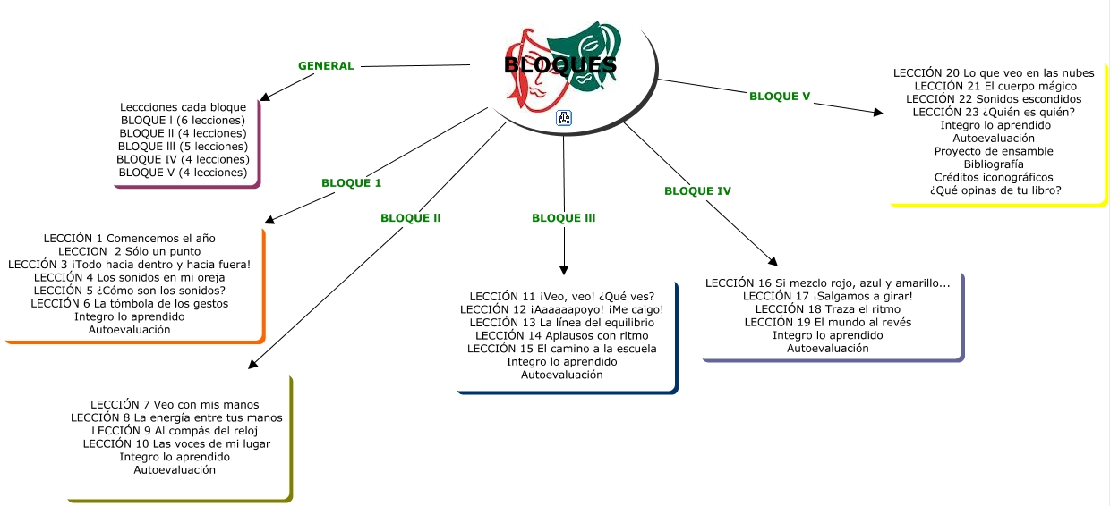 Este Cmap, tiene información relacionada con: MAPA SECUNDARIO 6, BLOQUES GENERAL Leccciones cada bloque BLOQUE l (6 lecciones) BLOQUE ll (4 lecciones) BLOQUE lll (5 lecciones) BLOQUE IV (4 lecciones) BLOQUE V (4 lecciones), BLOQUES BLOQUE lll LECCIÓN 11 ¡Veo, veo! ¿Qué ves? LECCIÓN 12 ¡Aaaaaapoyo! ¡Me caigo! LECCIÓN 13 La línea del equilibrio LECCIÓN 14 Aplausos con ritmo LECCIÓN 15 El camino a la escuela Integro lo aprendido Autoevaluación, BLOQUES BLOQUE V LECCIÓN 20 Lo que veo en las nubes LECCIÓN 21 El cuerpo mágico LECCIÓN 22 Sonidos escondidos LECCIÓN 23 ¿Quién es quién? Integro lo aprendido Autoevaluación Proyecto de ensamble Bibliografía Créditos iconográficos ¿Qué opinas de tu libro?, BLOQUES BLOQUE 1 LECCIÓN 1 Comencemos el año LECCION 2 Sólo un punto LECCIÓN 3 ¡Todo hacia dentro y hacia fuera! LECCIÓN 4 Los sonidos en mi oreja LECCIÓN 5 ¿Cómo son los sonidos? LECCIÓN 6 La tómbola de los gestos Integro lo aprendido Autoevaluación, BLOQUES BLOQUE IV LECCIÓN 16 Si mezclo rojo, azul y amarillo... LECCIÓN 17 ¡Salgamos a girar! LECCIÓN 18 Traza el ritmo LECCIÓN 19 El mundo al revés Integro lo aprendido Autoevaluación, BLOQUES BLOQUE ll LECCIÓN 7 Veo con mis manos LECCIÓN 8 La energía entre tus manos LECCIÓN 9 Al compás del reloj LECCIÓN 10 Las voces de mi lugar Integro lo aprendido Autoevaluación