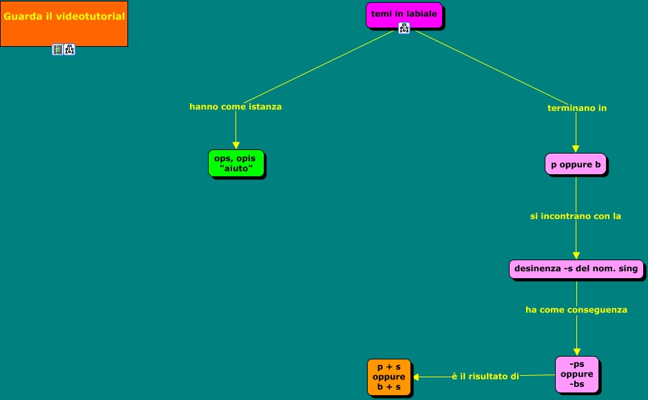 Questa Cmap, creata con IHMC CmapTools, contiene informazioni relative a: Temi in occlusiva labiale, temi in labiale hanno come istanza ops, opis "aiuto", desinenza -s del nom. sing ha come conseguenza -ps oppure -bs, -ps oppure -bs è il risultato di p + s oppure b + s, p oppure b si incontrano con la desinenza -s del nom. sing, temi in labiale terminano in p oppure b