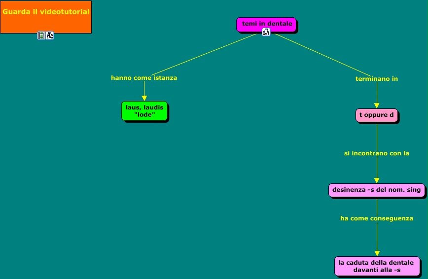 Questa Cmap, creata con IHMC CmapTools, contiene informazioni relative a: Temi in occlusiva dentale, temi in dentale hanno come istanza laus, laudis "lode", desinenza -s del nom. sing ha come conseguenza la caduta della dentale davanti alla -s, temi in dentale terminano in t oppure d, t oppure d si incontrano con la desinenza -s del nom. sing