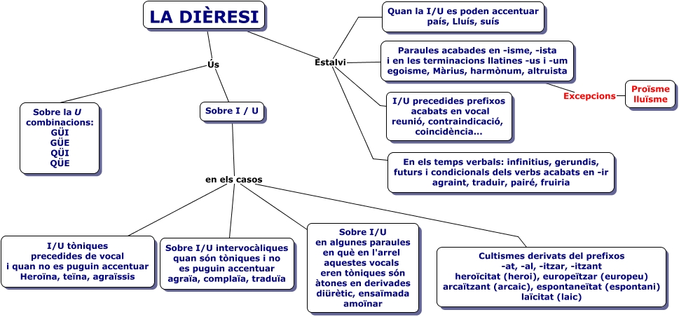 Este Cmap, tiene información relacionada con: La dièresi, Sobre I / U en els casos Sobre I/U en algunes paraules en què en l'arrel aquestes vocals eren tòniques són àtones en derivades diürètic, ensaïmada amoïnar, LA DIÈRESI Estalvi Quan la I/U es poden accentuar país, Lluís, suís, LA DIÈRESI Ús Sobre la U combinacions: GÜI GÜE QÜI QÜE, Paraules acabades en -isme, -ista i en les terminacions llatines -us i -um egoisme, Màrius, harmònum, altruista Excepcions Proïsme lluïsme, LA DIÈRESI Estalvi I/U precedides prefixos acabats en vocal reunió, contraindicació, coincidència..., LA DIÈRESI Estalvi Paraules acabades en -isme, -ista i en les terminacions llatines -us i -um egoisme, Màrius, harmònum, altruista, LA DIÈRESI Estalvi En els temps verbals: infinitius, gerundis, futurs i condicionals dels verbs acabats en -ir agraint, traduir, pairé, fruiria, LA DIÈRESI Ús Sobre I / U, Sobre I / U en els casos Sobre I/U intervocàliques quan són tòniques i no es puguin accentuar agraïa, complaïa, traduïa, Sobre I / U en els casos Cultismes derivats del prefixos -at, -al, -itzar, -itzant heroïcitat (heroi), europeïtzar (europeu) arcaïtzant (arcaic), espontaneïtat (espontani) laïcitat (laic), Sobre I / U en els casos I/U tòniques precedides de vocal i quan no es puguin accentuar Heroïna, teïna, agraïssis