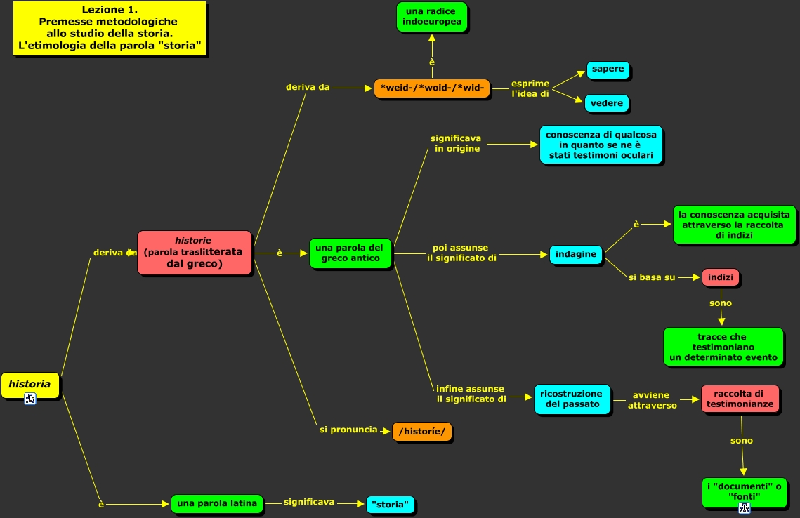 L'etimologia della parola storia, historia è una parola latina, ricostruzione del passato avviene attraverso raccolta di testimonianze, indagine si basa su indizi, una parola del greco antico significava in origine conoscenza di qualcosa in quanto se ne è stati testimoni oculari, una parola del greco antico infine assunse il significato di ricostruzione del passato, una parola latina significava "storia", indagine è la conoscenza acquisita attraverso la raccolta di indizi, indizi sono tracce che testimoniano un determinato evento, *weid-/*woid-/*wid- esprime l'idea di sapere, una parola del greco antico poi assunse il significato di indagine