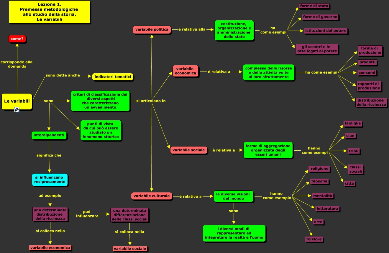 Le variabili, variabile politica è relativa alla costituzione, organizzazione e amministrazione dello stato, variabile culturale è relativa a le diverse visioni del mondo, forme di aggregazione organizzata degli esseri umani hanno come esempi clan, le diverse visioni del mondo hanno come esempio religione, criteri di classificazione dei diversi aspetti che caratterizzano un avvenimento si articolano in variabile culturale, una determinata differenziazione delle classi sociali si colloca nella variabile sociale, una determinata distribuzione della ricchezza si colloca nella variabile economica, una determinata distribuzione della ricchezza può influenzare una determinata differenziazione delle classi sociali, forme di aggregazione organizzata degli esseri umani hanno come esempi città, complesso delle risorse e delle attività volte al loro sfruttamento ha come esempi consumi