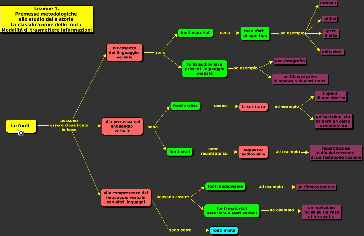Classificazione delle fonti. Il modo di trasmettere informazioni, fonti orali sono registrate su supporto audiovisivo, supporto audiovisivo ad esempio registrazione audio del racconto di un testimone oculare, la scrittura ad esempio un'iscrizione che celebra un certo avvenimento, alla presenza del linguaggio verbale sono fonti scritte, all'assenza del linguaggio verbale sono fonti audiovisive prive di linguaggio verbale, fonti audiovisive prive di linguaggio verbale ad esempio un filmato privo di sonoro o di testi scritti, alla compresenza del linguaggio verbale con altri linguaggi possono essere fonti materiali associate a testi verbali, la scrittura ad esempio l'opera di uno storico, alla compresenza del linguaggio verbale con altri linguaggi possono essere fonti audiovisive, Le fonti possono essere classificate in base alla compresenza del linguaggio verbale con altri linguaggi