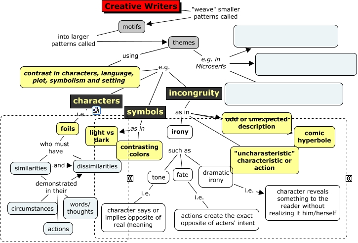 This Concept Map, created with IHMC CmapTools, has information related to: Contrast, contrast in characters, language, plot, symbolism and setting e.g. incongruity, fate i.e. actions create the exact opposite of acters' intent, contrast in characters, language, plot, symbolism and setting e.g. symbols, symbols as in contrasting colors, irony such as tone, incongruity as in irony, similarities demonstrated in their actions, themes e.g. in Microserfs, themes e.g. in Microserfs, motifs into larger patterns called themes, similarities demonstrated in their circumstances, dramatic irony i.e. character reveals something to the reader without realizing it him/herself, similarities demonstrated in their words/ thoughts, foils who must have similarities, similarities and dissimilarities, incongruity as in comic hyperbole, themes using contrast in characters, language, plot, symbolism and setting, incongruity as in "uncharasteristic" characteristic or action, similarities demonstrated in their dissimilarities, Creative Writers "weave" smaller patterns called motifs