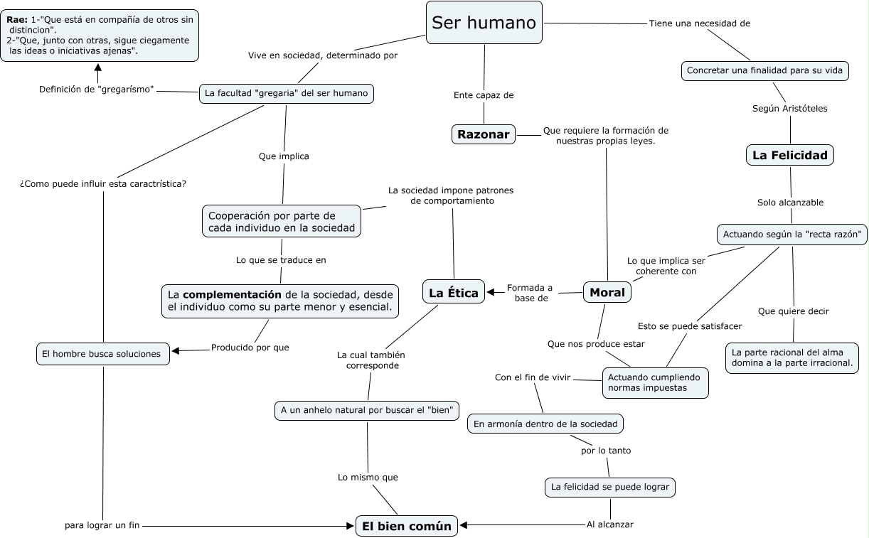 Este Cmap, tiene información relacionada con: Filosófica, La facultad "gregaria" del ser humano Que implica Cooperación por parte de cada individuo en la sociedad, Concretar una finalidad para su vida Según Aristóteles La Felicidad, Ser humano Tiene una necesidad de Concretar una finalidad para su vida, La Felicidad Solo alcanzable Actuando según la "recta razón", La facultad "gregaria" del ser humano ¿Como puede influir esta caractrística? El hombre busca soluciones, La felicidad se puede lograr Al alcanzar El bien común, El hombre busca soluciones para lograr un fin El bien común, Cooperación por parte de cada individuo en la sociedad La sociedad impone patrones de comportamiento La Ética, Ser humano Vive en sociedad, determinado por La facultad "gregaria" del ser humano, Ser humano Ente capaz de Razonar, La facultad "gregaria" del ser humano Definición de "gregarísmo" Rae: 1-"Que está en compañía de otros sin distincion". 2-"Que, junto con otras, sigue ciegamente las ideas o iniciativas ajenas"., Cooperación por parte de cada individuo en la sociedad Lo que se traduce en La complementación de la sociedad, desde el individuo como su parte menor y esencial., Actuando cumpliendo normas impuestas Con el fin de vivir En armonía dentro de la sociedad, Moral Formada a base de La Ética, Actuando según la "recta razón" Lo que implica ser coherente con Moral, En armonía dentro de la sociedad por lo tanto La felicidad se puede lograr, Actuando según la "recta razón" Que quiere decir La parte racional del alma domina a la parte irracional., A un anhelo natural por buscar el "bien" Lo mismo que El bien común, La complementación de la sociedad, desde el individuo como su parte menor y esencial. Producido por que El hombre busca soluciones, Actuando según la "recta razón" Esto se puede satisfacer Actuando cumpliendo normas impuestas