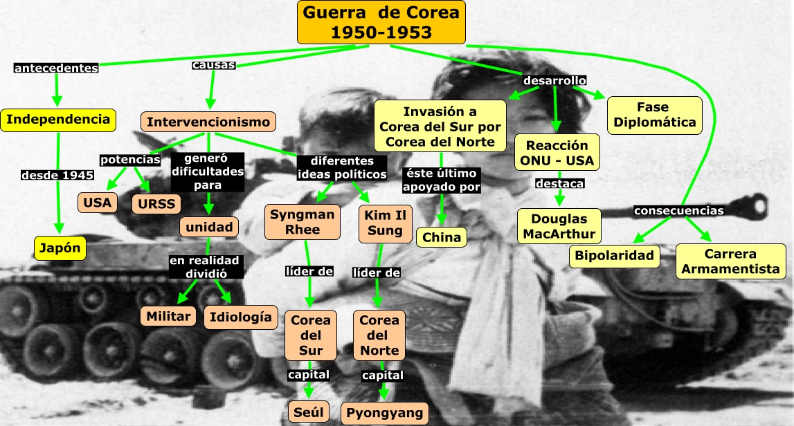 Este Cmap, tiene información relacionada con: Guerra de Corea, Invasión a Corea del Sur por Corea del Norte éste último apoyado por China, Independencia desde 1945 Japón, Intervencionismo diferentes ideas políticos Syngman Rhee, Intervencionismo potencias URSS, Guerra de Corea 1950-1953 consecuencias Carrera Armamentista, unidad en realidad dividió Idiología, Guerra de Corea 1950-1953 desarrollo Invasión a Corea del Sur por Corea del Norte, Kim Il Sung líder de Corea del Norte, Guerra de Corea 1950-1953 desarrollo Fase Diplomática, Syngman Rhee líder de Corea del Sur, Intervencionismo potencias USA, Intervencionismo generó dificultades para unidad, Guerra de Corea 1950-1953 desarrollo Reacción ONU - USA, Reacción ONU - USA destaca Douglas MacArthur, Guerra de Corea 1950-1953 antecedentes Independencia, Intervencionismo diferentes ideas políticos Kim Il Sung, Corea del Sur capital Seúl, Guerra de Corea 1950-1953 consecuencias Bipolaridad, Corea del Norte capital Pyongyang, Guerra de Corea 1950-1953 causas Intervencionismo