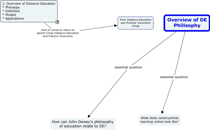 CIDERpedia - Overview of DE - Philosopy, Overview of DE Philisophy essential question How can John Dewey's philosophy of education relate to DE?, Overview of DE Philisophy essential question What does constructivist learning online look like?, 1. Overview of Distance Education * Philosopy * Definition * Models * Applications click on arrow to return to parent Cmap Distance Education and Practice Taxonomy from Distance Education and Practice Taxonomy Cmap
