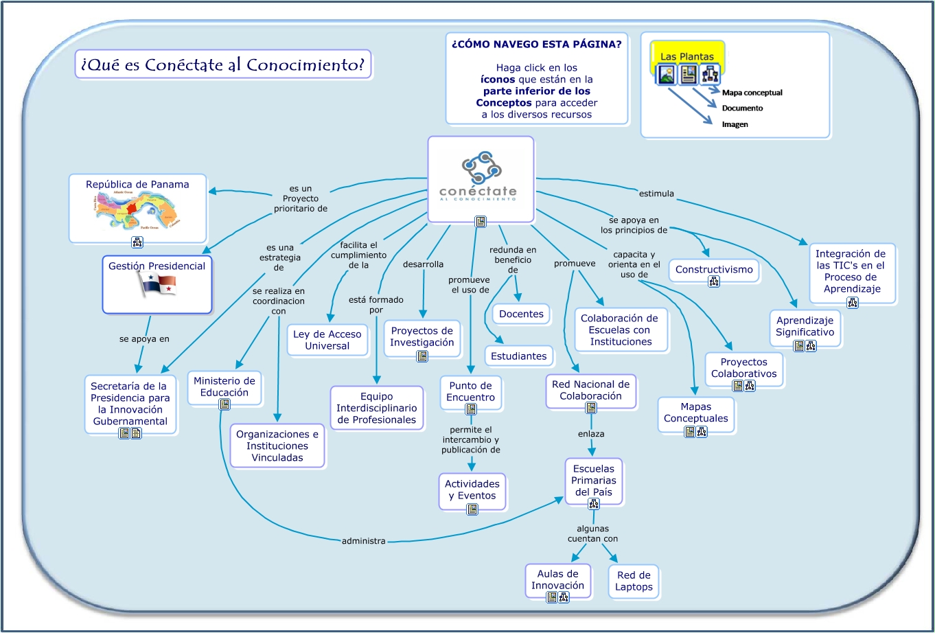 Este Cmap, tiene información relacionada con: Conéctate al Conocimiento, estimula Integración de las TIC's en el Proceso de Aprendizaje, se realiza en coordinacion con Organizaciones e Instituciones Vinculadas, es un Proyecto prioritario de Gestión Presidencial, Gestión Presidencial se apoya en Secretaría de la Presidencia para la Innovación Gubernamental, se realiza en coordinacion con Ministerio de Educación, desarrolla Proyectos de Investigación, promueve el uso de Punto de Encuentro, Red Nacional de Colaboración enlaza Escuelas Primarias del País, capacita y orienta en el uso de Mapas Conceptuales, promueve Red Nacional de Colaboración, capacita y orienta en el uso de Proyectos Colaborativos, se apoya en los principios de Aprendizaje Significativo, redunda en beneficio de Docentes, Escuelas Primarias del País algunas cuentan con Aulas de Innovación, Punto de Encuentro permite el intercambio y publicación de Actividades y Eventos, está formado por Equipo Interdisciplinario de Profesionales, es una estrategia de Secretaría de la Presidencia para la Innovación Gubernamental, se apoya en los principios de Constructivismo, redunda en beneficio de Estudiantes, Escuelas Primarias del País algunas cuentan con Red de Laptops