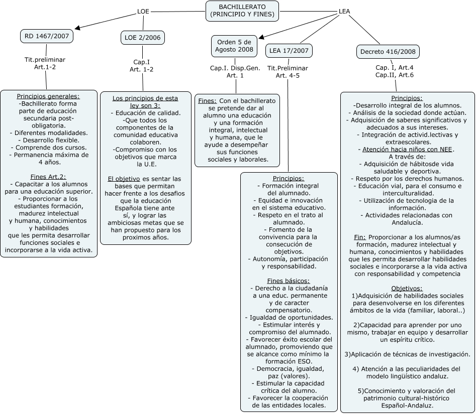 Este Cmap, tiene información relacionada con: Bachillerato-Princípios y fines, RD 1467/2007 Tit.preliminar Art.1-2 Principios generales: -Bachillerato forma parte de educación secundaria post- obligatoria. - Diferentes modalidades. - Desarrollo flexible. - Comprende dos cursos. - Permanencia máxima de 4 años. Fines Art.2: - Capacitar a los alumnos para una educación superior. - Proporcionar a los estudiantes formación, madurez intelectual y humana, conocimientos y habilidades que les permita desarrollar funciones sociales e incorporarse a la vida activa., BACHILLERATO (PRINCIPIO Y FINES) LEA Orden 5 de Agosto 2008, LOE 2/2006 Cap.I Art. 1-2 Los principios de esta ley son 3: - Educación de calidad. -Que todos los componentes de la comunidad educativa colaboren. -Compromiso con los objetivos que marca la U.E. El objetivo es sentar las bases que permitan hacer frente a los desafios que la educación Española tiene ante sí, y lograr las ambiciosas metas que se han propuesto para los proximos años., Decreto 416/2008 Cap. I, Art.4 Cap.II, Art.6 Principios: -Desarrollo integral de los alumnos. - Análisis de la sociedad donde actúan. - Adquisición de saberes significativos y adecuados a sus intereses. - Integración de activid.lectivas y extraescolares. - Atención hacia niños con NEE. A través de: - Adquisición de hábitosde vida saludable y deportiva. - Respeto por los derechos humanos. - Educación vial, para el consumo e interculturalidad. - Utilización de tecnologia de la información. - Actividades relacionadas con Andalucía. Fin: Proporcionar a los alumnos/as formación, madurez intelectual y humana, conocimientos y habilidades que les permita desarrollar habilidades sociales e incorporarse a la vida activa con responsabilidad y competencia Objetivos: 1)Adquisición de habilidades sociales para desenvolverse en los diferentes ámbitos de la vida (familiar, laboral..) 2)Capacidad para aprender por uno mismo, trabajar en equipo y desarrollar un espíritu crítico. 3)Aplicación de técnicas de investigación. 4) Atención a las peculiaridades del modelo lingüístico andaluz. 5)Conocimiento y valoración del patrimonio cultural-histórico Español-Andaluz., BACHILLERATO (PRINCIPIO Y FINES) LEA LEA 17/2007, BACHILLERATO (PRINCIPIO Y FINES) LEA Decreto 416/2008, LEA 17/2007 Tit.Preliminar Art. 4-5 Principios: - Formación integral del alumnado. - Equidad e innovación en el sistema educativo. - Respeto en el trato al alumnado. - Fomento de la convivencia para la consecución de objetivos. - Autonomía, participación y responsabilidad. Fines básicos: - Derecho a la ciudadanía a una educ. permanente y de caracter compensatorio. - Igualdad de oportunidades. - Estimular interés y compromiso del alumnado. - Favorecer éxito escolar del alumnado, promoviendo que se alcance como mínimo la formación ESO. - Democracia, igualdad, paz (valores). - Estimular la capacidad crítica del alumno. - Favorecer la cooperación de las entidades locales., BACHILLERATO (PRINCIPIO Y FINES) LOE LOE 2/2006, BACHILLERATO (PRINCIPIO Y FINES) LOE RD 1467/2007, Orden 5 de Agosto 2008 Cap.I. Disp.Gen. Art. 1 Fines: Con el bachillerato se pretende dar al alumno una educación y una formación integral, intelectual y humana, que le ayude a desempeñar sus funciones sociales y laborales.