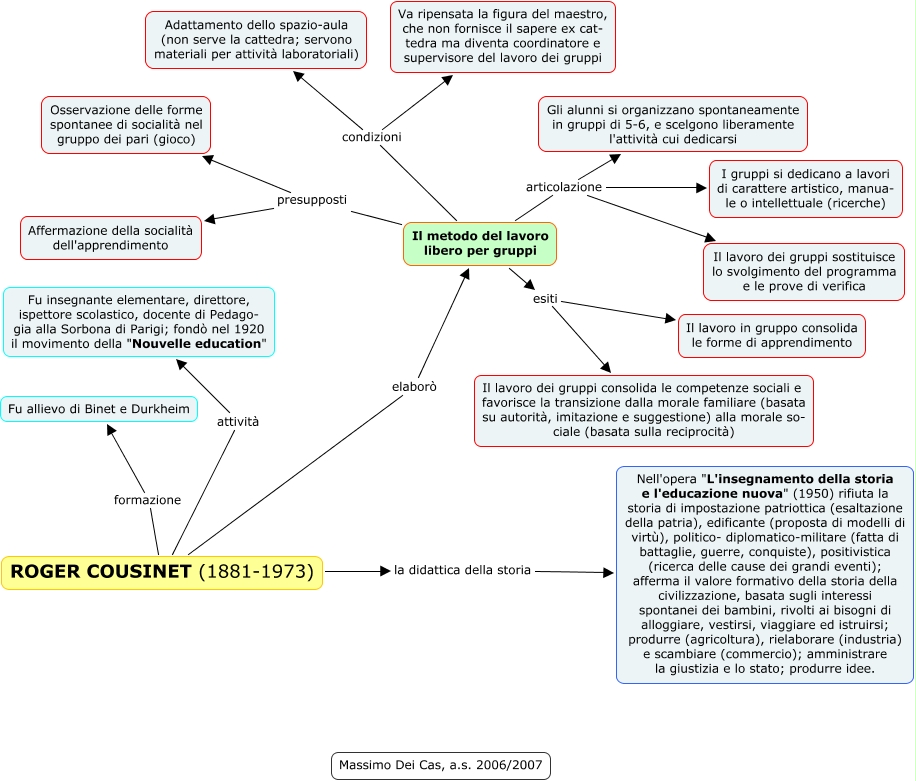 This Concept Map, created with IHMC CmapTools, has information related to: cousinet, Il metodo del lavoro libero per gruppi presupposti Osservazione delle forme spontanee di socialità nel gruppo dei pari (gioco), Il metodo del lavoro libero per gruppi condizioni Adattamento dello spazio-aula (non serve la cattedra; servono materiali per attività laboratoriali), ROGER COUSINET (1881-1973) formazione Fu allievo di Binet e Durkheim, Il metodo del lavoro libero per gruppi articolazione Gli alunni si organizzano spontaneamente in gruppi di 5-6, e scelgono liberamente l'attività cui dedicarsi, ROGER COUSINET (1881-1973) la didattica della storia Nell'opera "L'insegnamento della storia e l'educazione nuova" (1950) rifiuta la storia di impostazione patriottica (esaltazione della patria), edificante (proposta di modelli di virtù), politico- diplomatico-militare (fatta di battaglie, guerre, conquiste), positivistica (ricerca delle cause dei grandi eventi); afferma il valore formativo della storia della civilizzazione, basata sugli interessi spontanei dei bambini, rivolti ai bisogni di alloggiare, vestirsi, viaggiare ed istruirsi; produrre (agricoltura), rielaborare (industria) e scambiare (commercio); amministrare la giustizia e lo stato; produrre idee., ROGER COUSINET (1881-1973) attività Fu insegnante elementare, direttore, ispettore scolastico, docente di Pedago- gia alla Sorbona di Parigi; fondò nel 1920 il movimento della "Nouvelle education", Il metodo del lavoro libero per gruppi esiti Il lavoro dei gruppi consolida le competenze sociali e favorisce la transizione dalla morale familiare (basata su autorità, imitazione e suggestione) alla morale so- ciale (basata sulla reciprocità), Il metodo del lavoro libero per gruppi presupposti Affermazione della socialità dell'apprendimento, Il metodo del lavoro libero per gruppi condizioni Va ripensata la figura del maestro, che non fornisce il sapere ex cat- tedra ma diventa coordinatore e supervisore del lavoro dei gruppi, ROGER COUSINET (1881-1973) elaborò Il metodo del lavoro libero per gruppi, Il metodo del lavoro libero per gruppi articolazione Il lavoro dei gruppi sostituisce lo svolgimento del programma e le prove di verifica, Il metodo del lavoro libero per gruppi esiti Il lavoro in gruppo consolida le forme di apprendimento, Il metodo del lavoro libero per gruppi articolazione I gruppi si dedicano a lavori di carattere artistico, manua- le o intellettuale (ricerche)