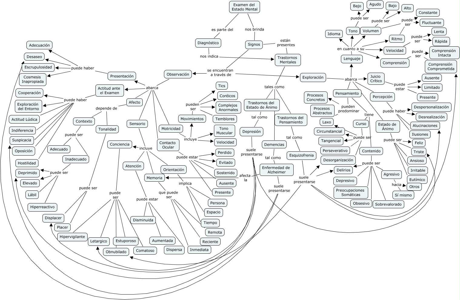 Examen del Estado Mental, Conciencia puede ser Estuporoso, Volumen puede ser Constante, Orientación implica Persona, Juicio Crítico puede estar Limitado, Pensamiento tiene Curso, Exploración abarca Percepción, Tono puede ser Bajo, Contenido puede ser Depresivo, Presentación puede haber Escrupulosidad, Signos están presentes Trastornos Mentales