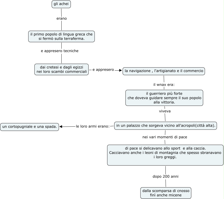 This Concept Map, created with IHMC CmapTools, has information related to: gli achei, il guerriero più forte che doveva guidare sempre il suo popolo alla vittoria. viveva in un palazzo che sorgeva vicino all'acropoli(città alta)., in un palazzo che sorgeva vicino all'acropoli(città alta). nei vari momenti di pace di pace si delicavano allo sport e alla caccia. Cacciavano anche i leoni di montagnia che spesso sbranavano i loro greggi., dai cretesi e dagli egizzi nei loro scambi commerciali e appresero la navigazione , l'artigianato e il commercio, di pace si delicavano allo sport e alla caccia. Cacciavano anche i leoni di montagnia che spesso sbranavano i loro greggi. dopo 200 anni dalla scomparsa di cnosso finì anche micene, il primo popolo di lingua greca che si fermò sulla terraferma. e appresero tecniche dai cretesi e dagli egizzi nei loro scambi commerciali, in un palazzo che sorgeva vicino all'acropoli(città alta). le loro armi erano: un cortopugniale e una spada., gli achei erano il primo popolo di lingua greca che si fermò sulla terraferma., la navigazione , l'artigianato e il commercio il wnax era: il guerriero più forte che doveva guidare sempre il suo popolo alla vittoria.