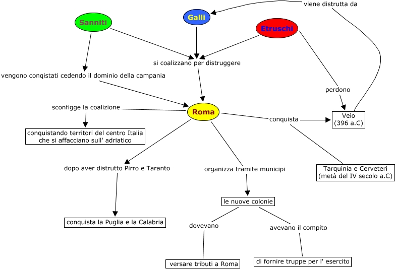Questa Mappa Concettuale ha informazioni correlate a: La conquista dell' Italia da parte di Roma, Roma conquista Veio (396 a.C), le nuove colonie dovevano versare tributi a Roma, Roma conquista Tarquinia e Cerveteri (metà del IV secolo a.C), Galli si coalizzano per distruggere Roma, Roma dopo aver distrutto Pirro e Taranto conquista la Puglia e la Calabria, Sanniti si coalizzano per distruggere Roma, Etruschi si coalizzano per distruggere Roma, Roma organizza tramite municipi le nuove colonie, Veio (396 a.C) viene distrutta da Galli, le nuove colonie avevano il compito di fornire truppe per l' esercito, Roma sconfigge la coalizione conquistando territori del centro Italia che si affacciano sull' adriatico, Etruschi perdono Veio (396 a.C), Sanniti vengono conqistati cedendo il dominio della campania Roma
